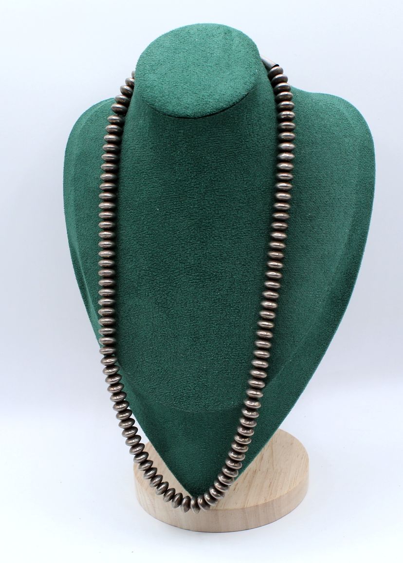 Fantastic unsigned bench beaded Native 10mm necklace. Stamped cones but not hallmark. There is one bead that has an imperfection of some left over silver creating a little bump or maybe it is a signature bead? The necklace measures 25" end to end and wearable 22.5". It is strung on a foxtail chain.