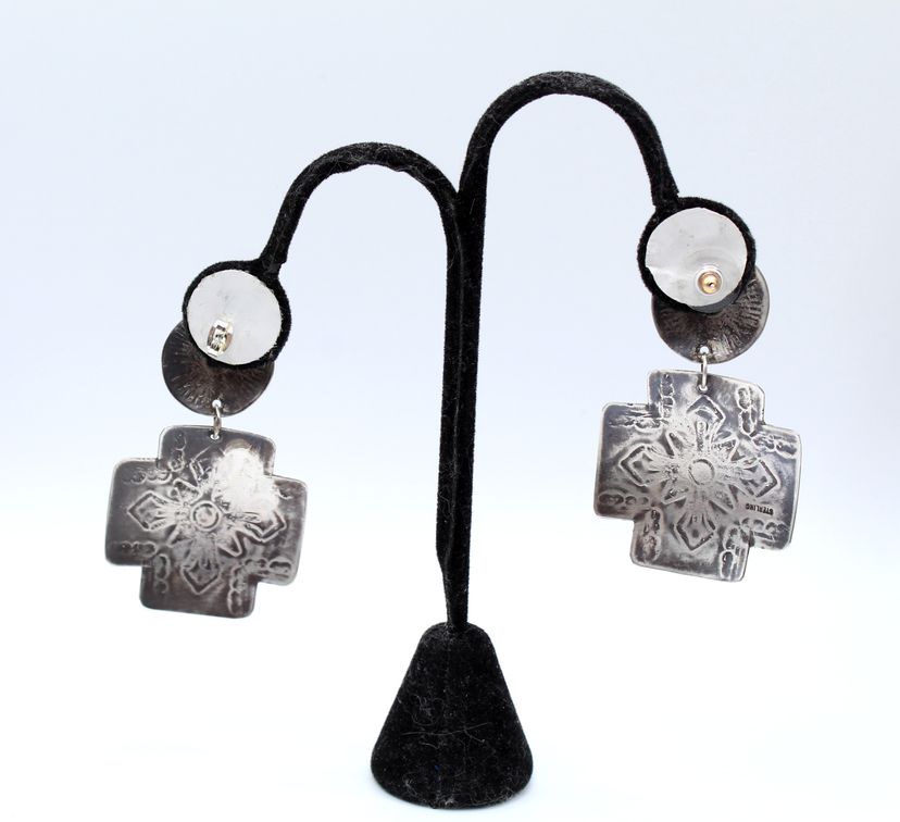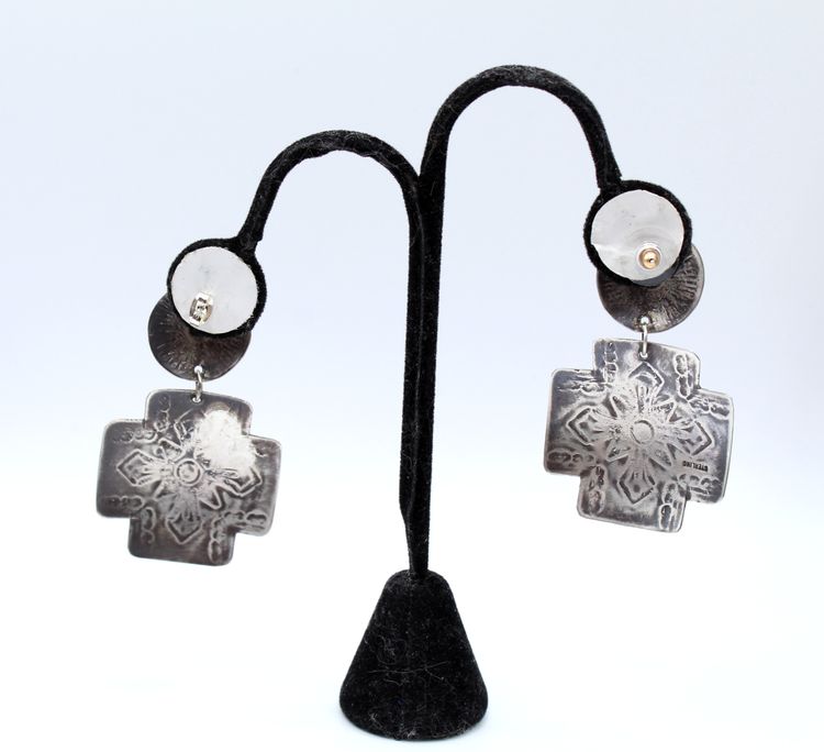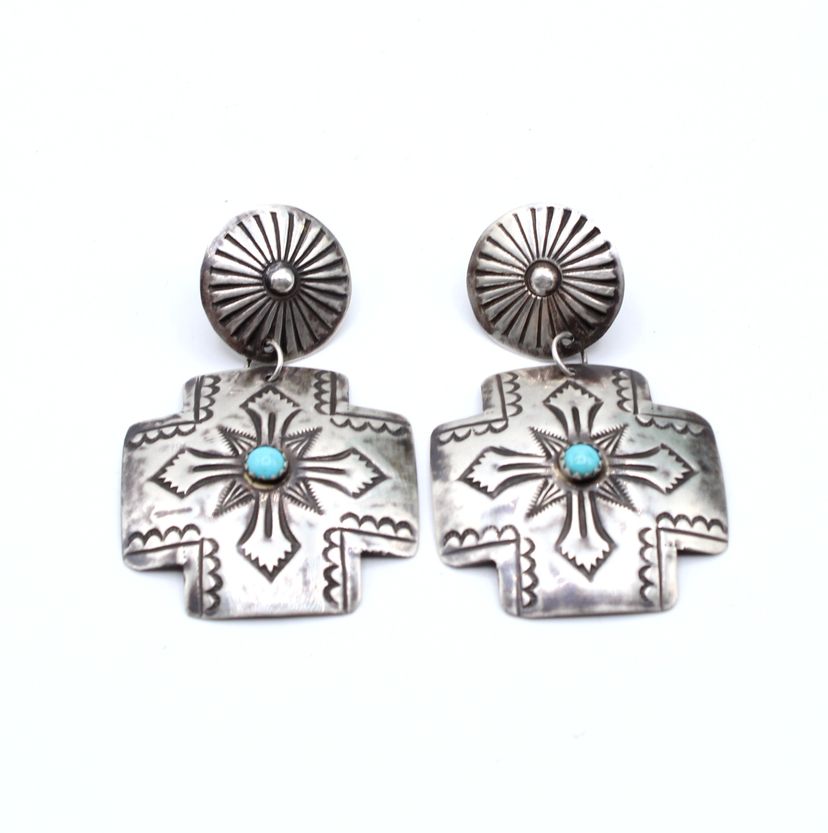 Fantastic unsigned southwest earrings likely Navajo. Just stamped sterling. Beautiful hand stamp work with a center turquoise stone set in a saw tooth bezel. The stud part are the style of a concho. Measures approx 2.25" x 1.5"