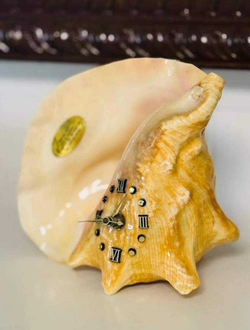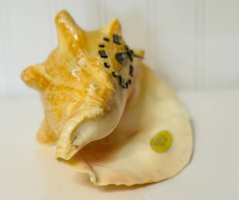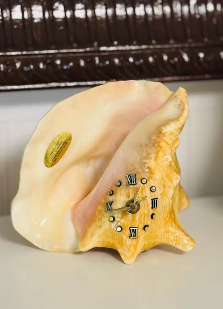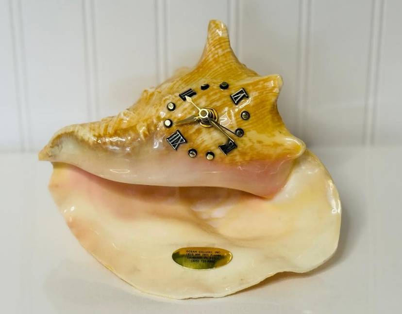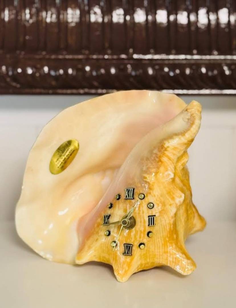 This vintage nautical conch shell with a functional metal clock face is a unique and rare decor piece that will surely stand out in any collection. The intricate design and craftsmanship of the piece make it a special addition to any home or office space. Its nautical theme adds a touch of charm and nostalgia, while the functionality of the clock face adds a practical element to the decor. Overall, this item is a one-of-a-kind piece that is sure to be a conversation starter.