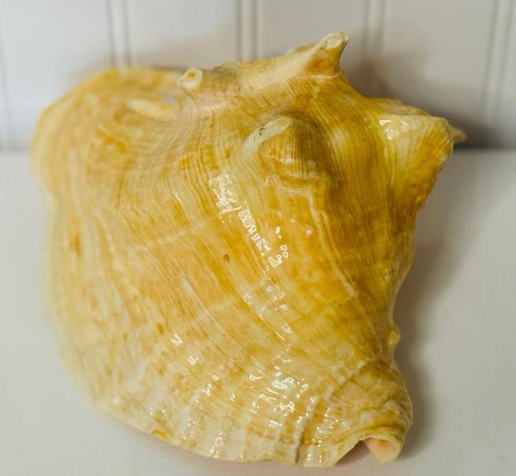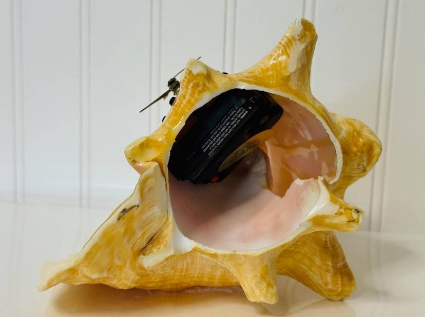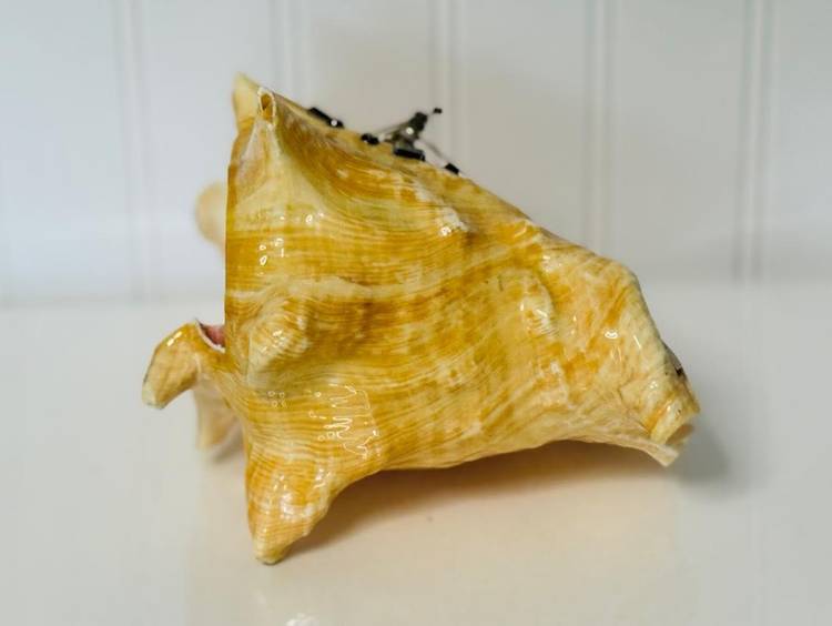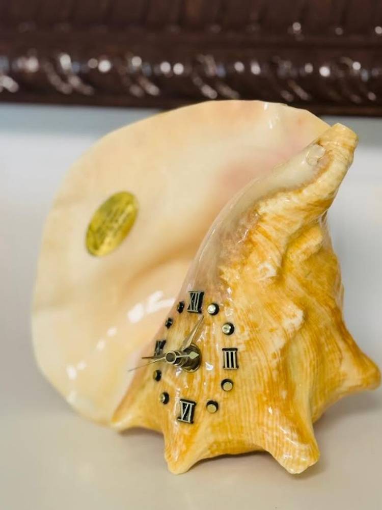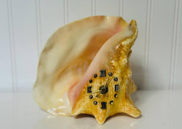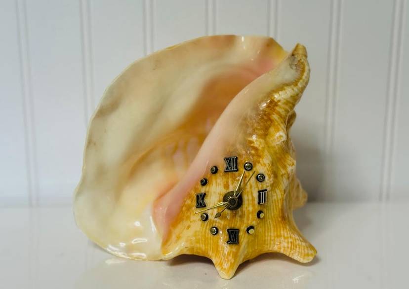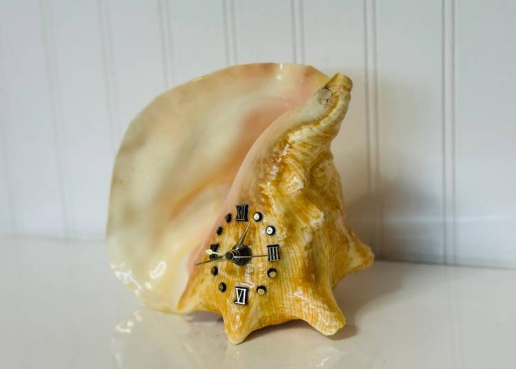 This vintage nautical conch shell with a functional metal clock face is a unique and rare decor piece that will surely stand out in any collection. The intricate design and craftsmanship of the piece make it a special addition to any home or office space. Its nautical theme adds a touch of charm and nostalgia, while the functionality of the clock face adds a practical element to the decor. Overall, this item is a one-of-a-kind piece that is sure to be a conversation starter.