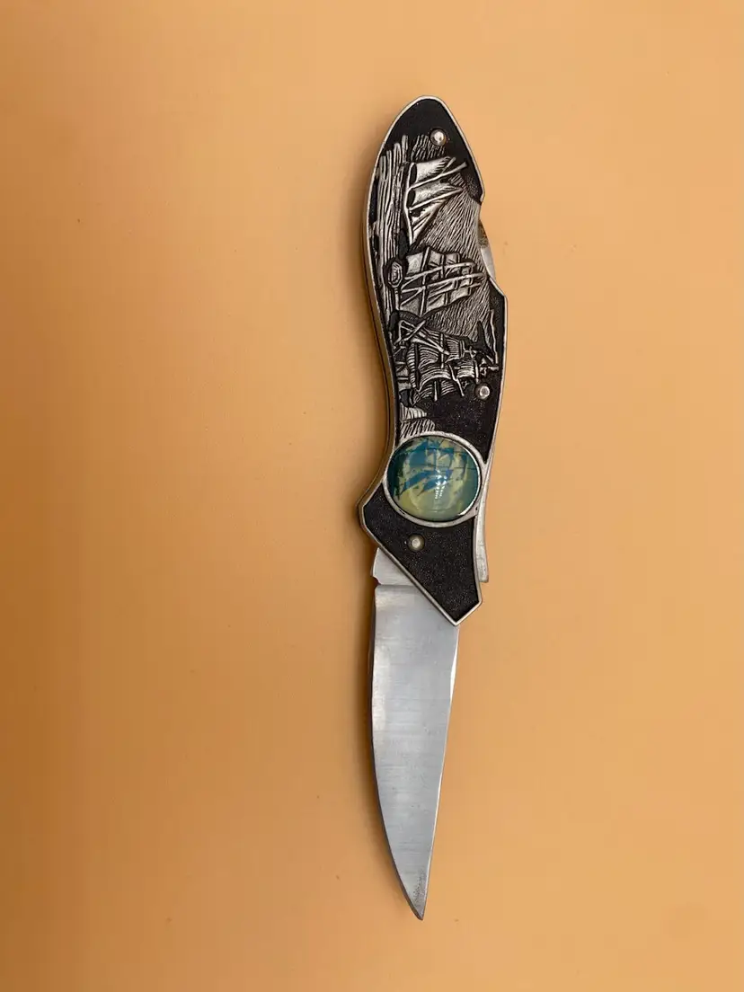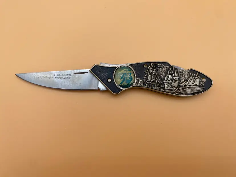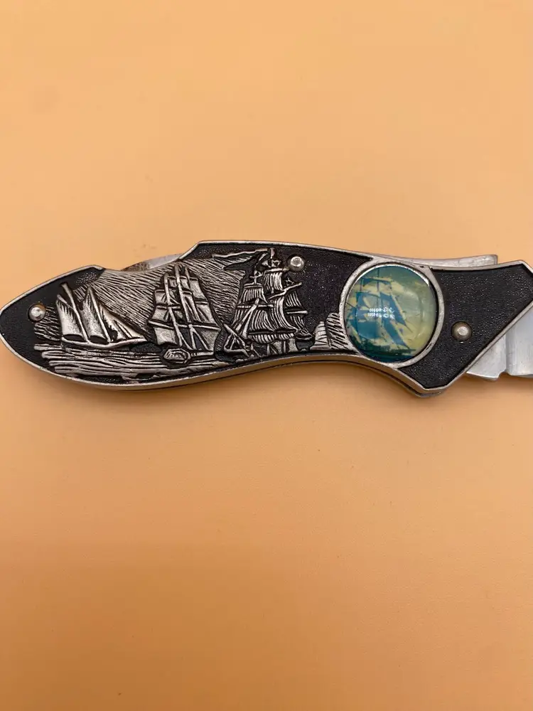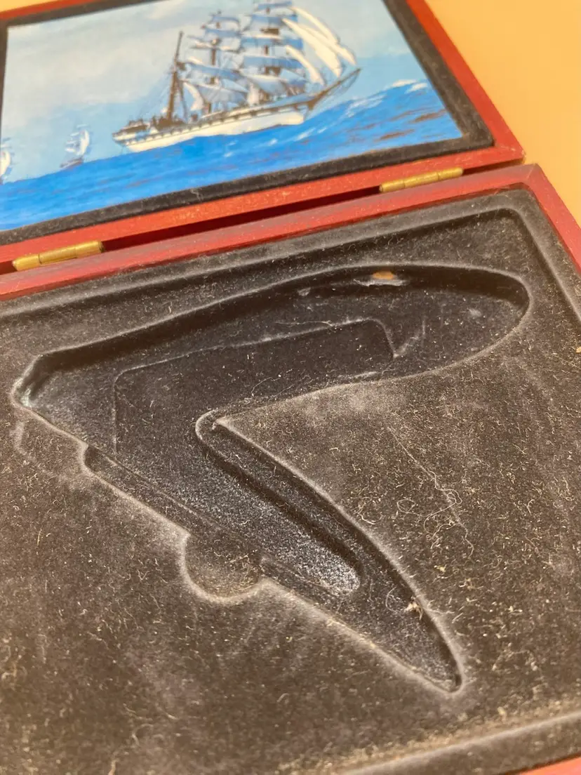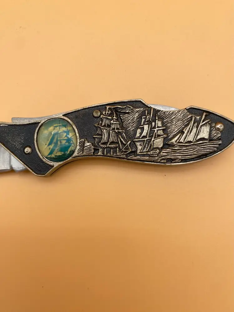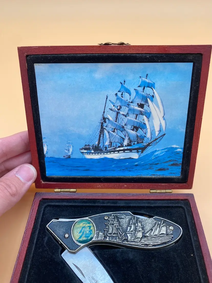 You are purchasing one vintage Nautical Themed Pocket Knife in a Wooden Box. The Blade of this Knife is just under 3 inches in length. This Knife is overall good condition. No signs of wear on the Handle. Minimal signs of wear on the Blade. No bending or cracking of the Knife. Sharp Blade. No issues with the Locking mechanism. See images for signs of wear on the Box, most notably of the final two images of interior wear and a broken Box Lock.