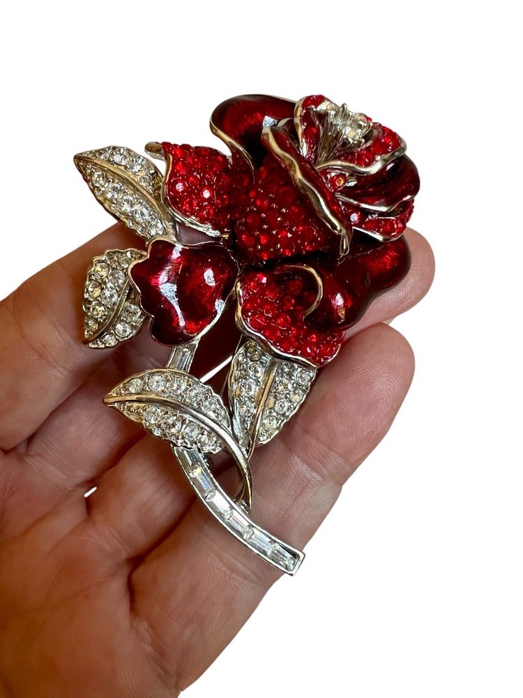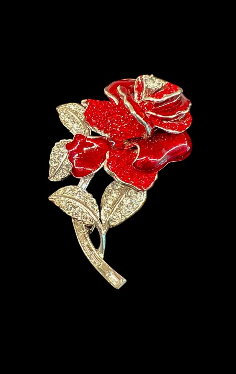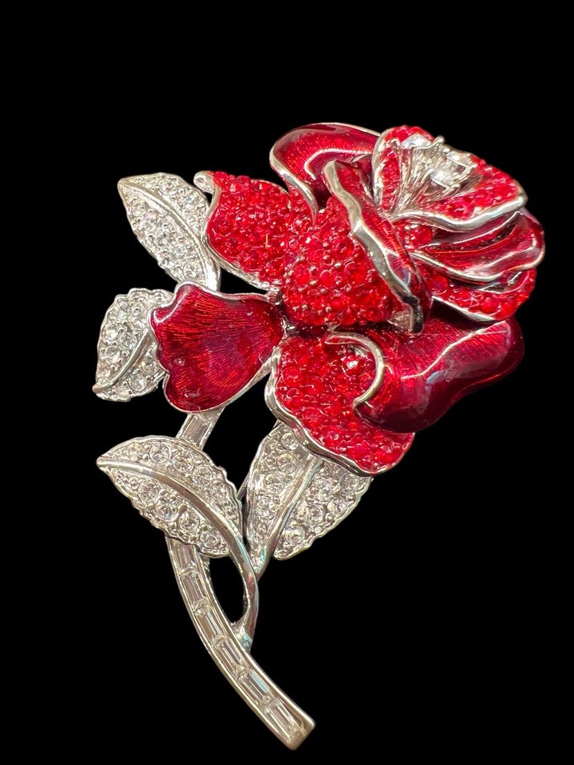 BLING!! Layered pave clear stones on petals & stem.Stunning Red pave rhinestones and crimson enamel Red petals.