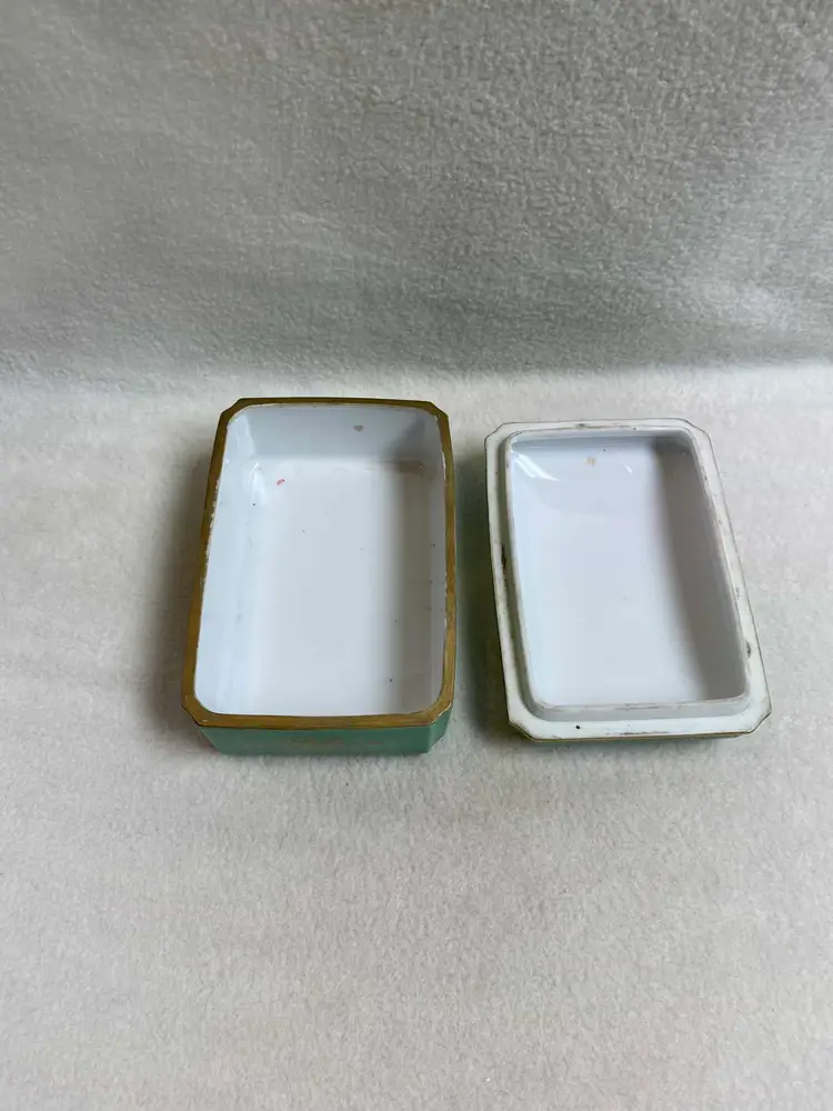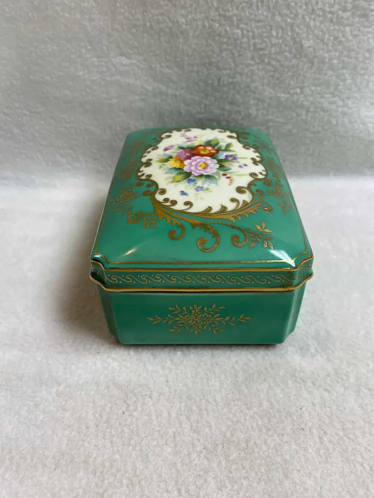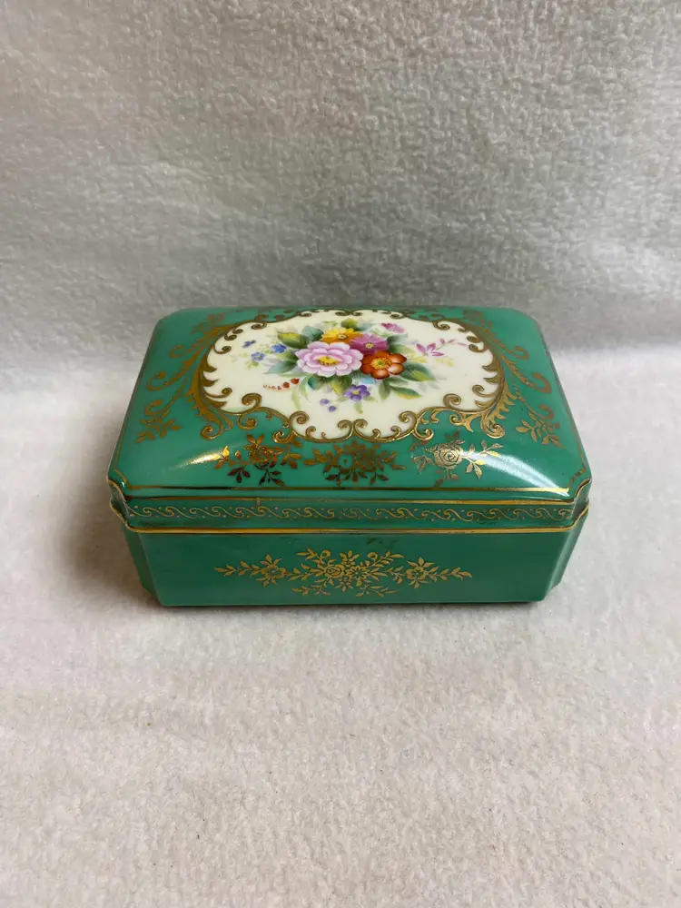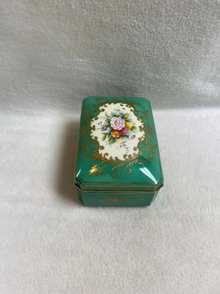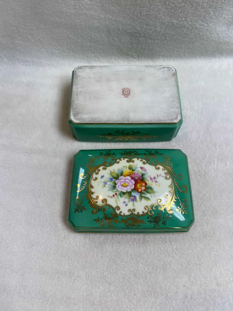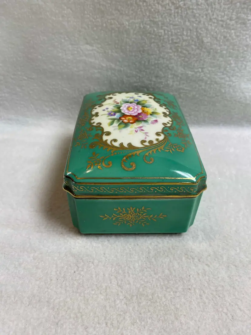 This is a vintage Noritake hand-painted lidded vanity/trinket box. The box is a green color and has a colorful floral design on the lid along with gold highlighting. The box has a few minor surface marks but is in overall good condition.