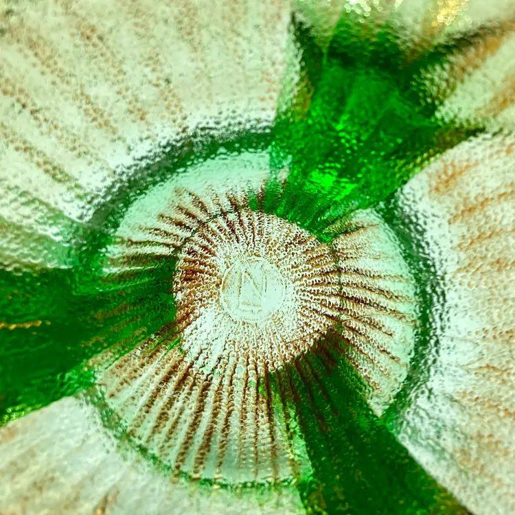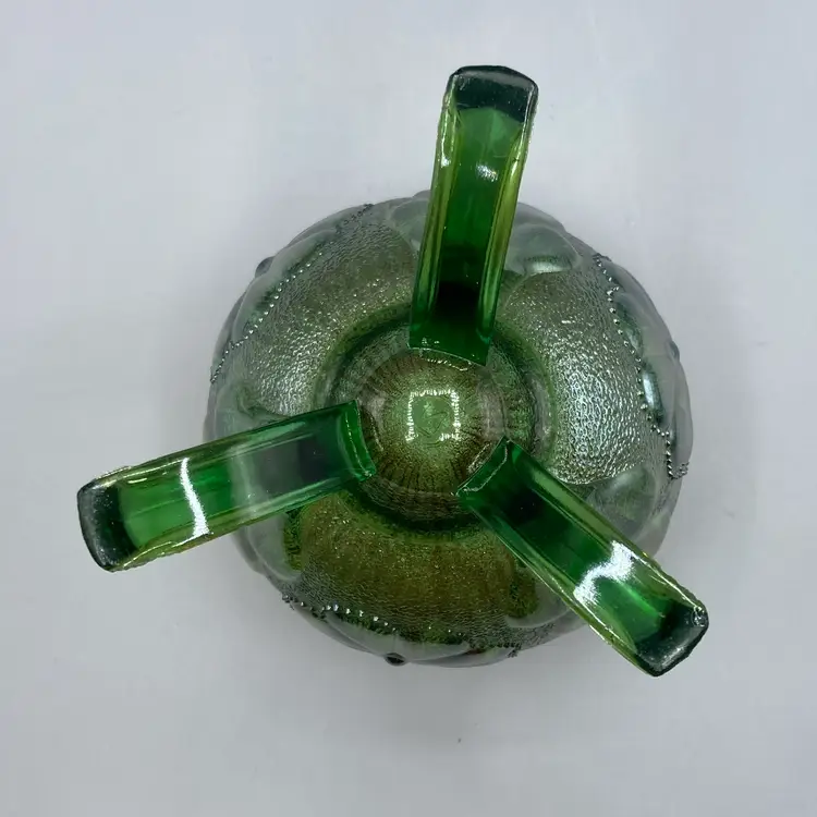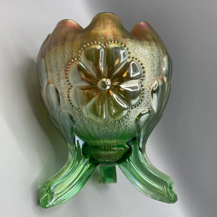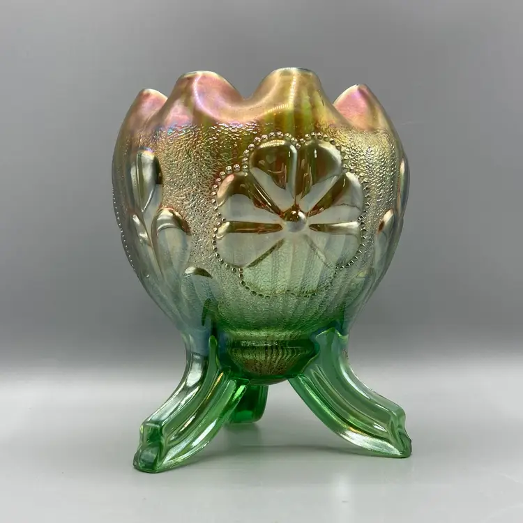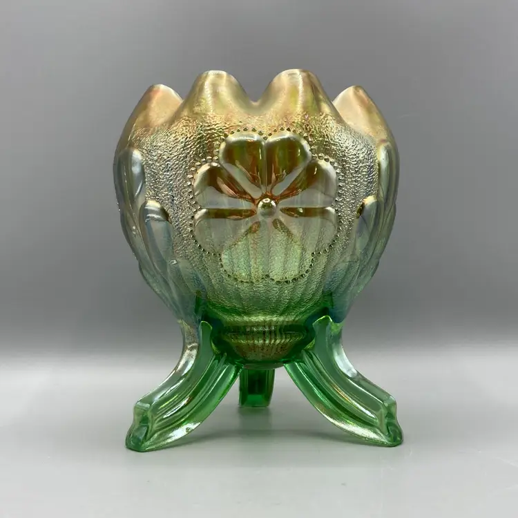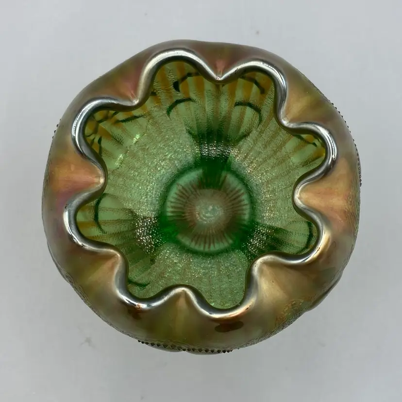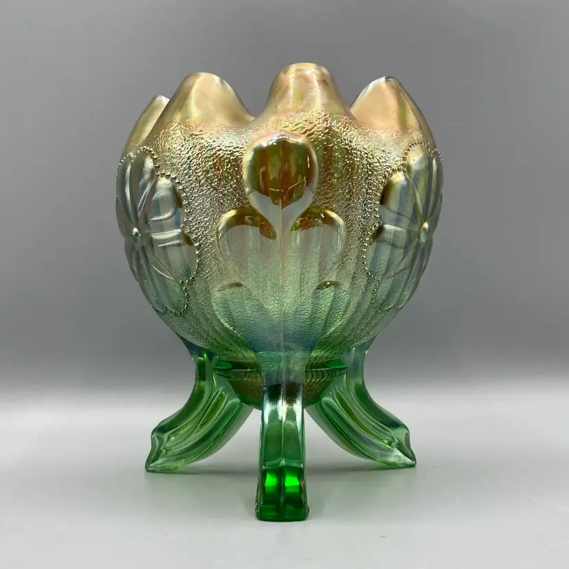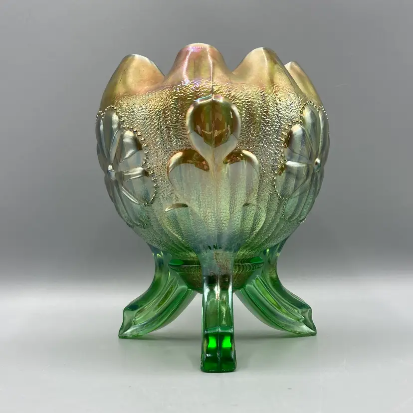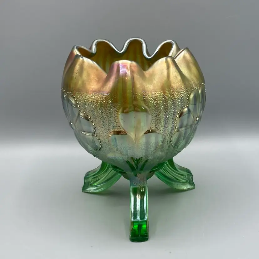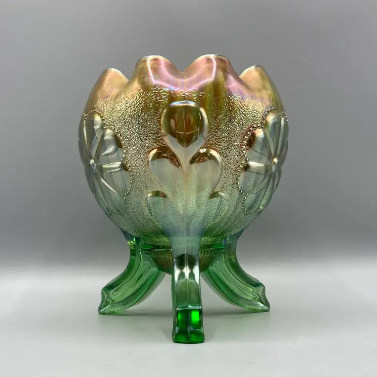 Vintage Northwood Carnival Glass Daisy & Plume Rose Bowl 3 Footed Green Base Color