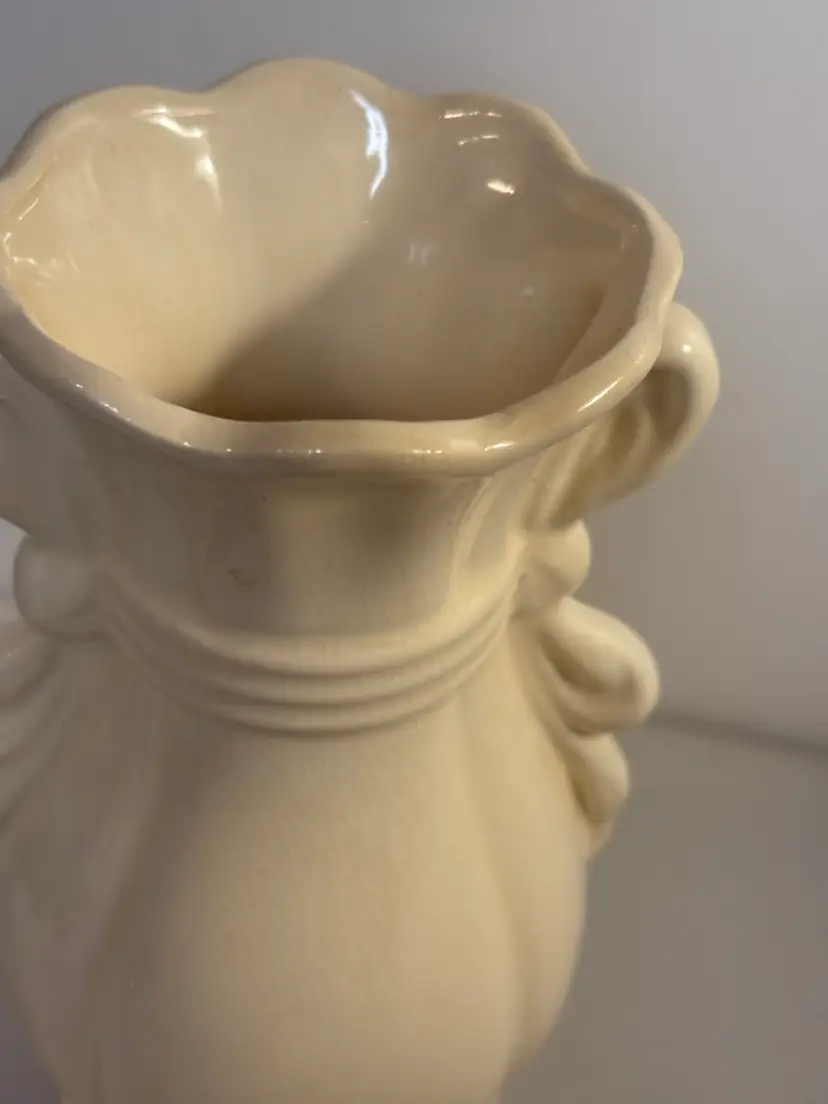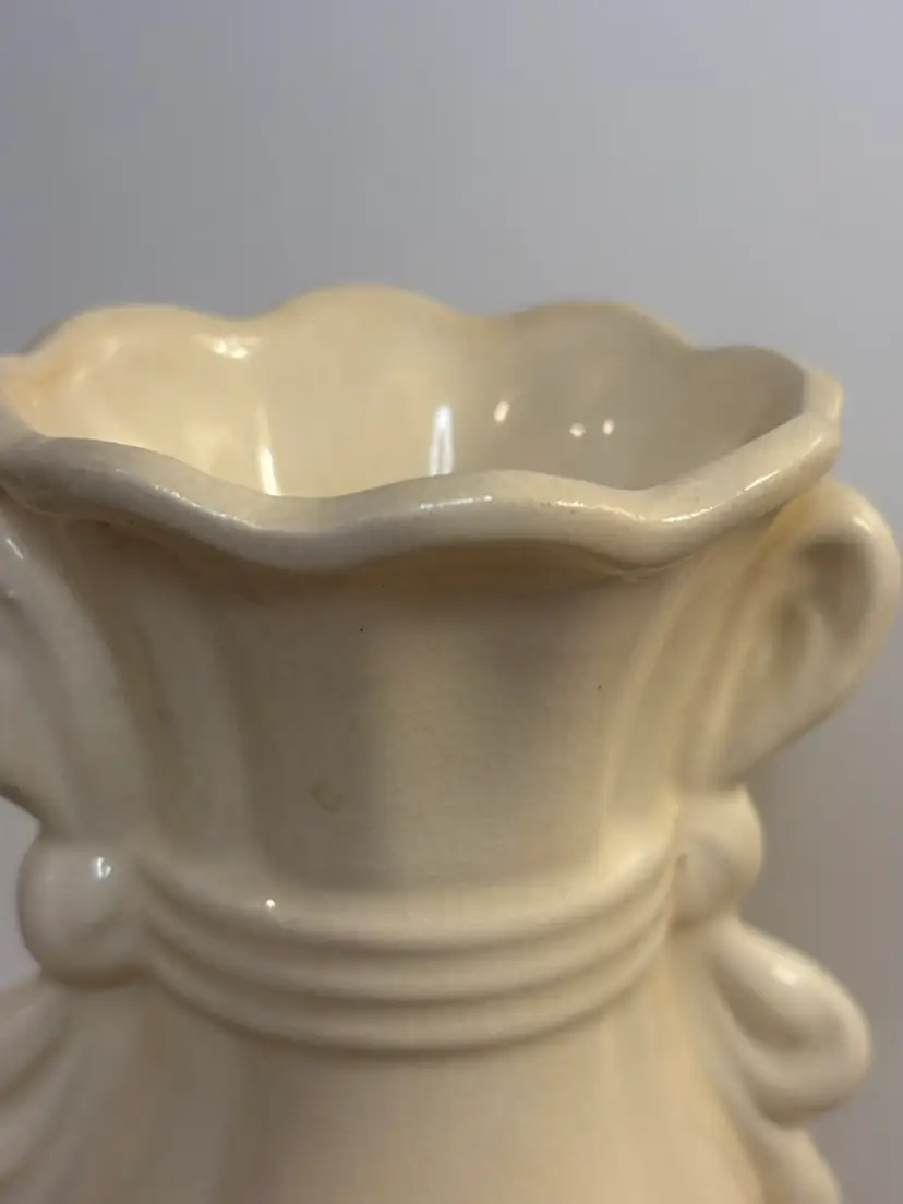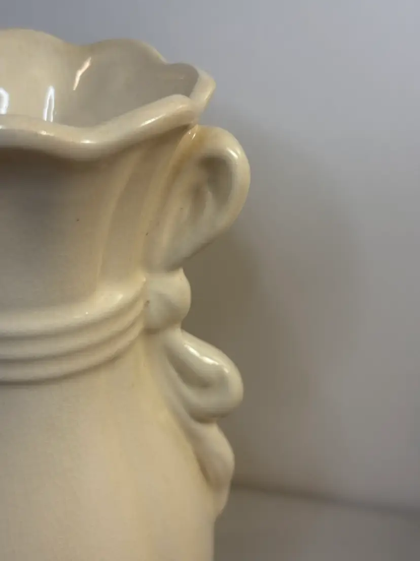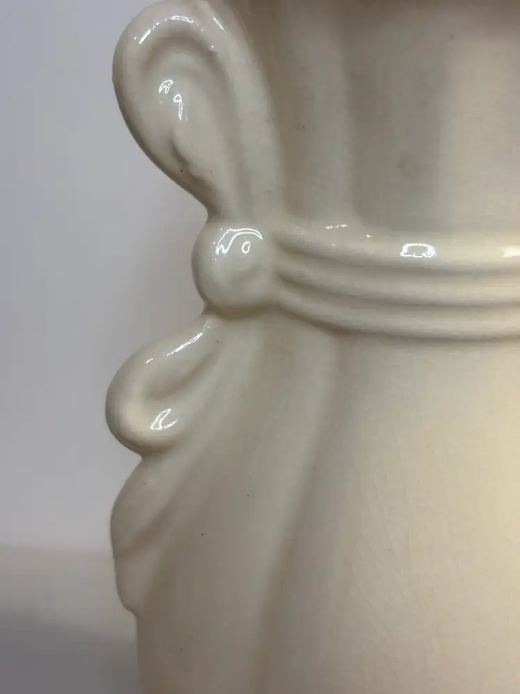 This vintage off white vase features ribbon or bow handles, adding a unique and elegant touch to its design. With a solid pattern and glazed finish, this medium-sized vase exudes a classic and timeless appeal. Perfect for collectors of decorative items or anyone looking to add a touch of vintage charm to their home decor, this vase is a versatile piece that can complement a variety of styles