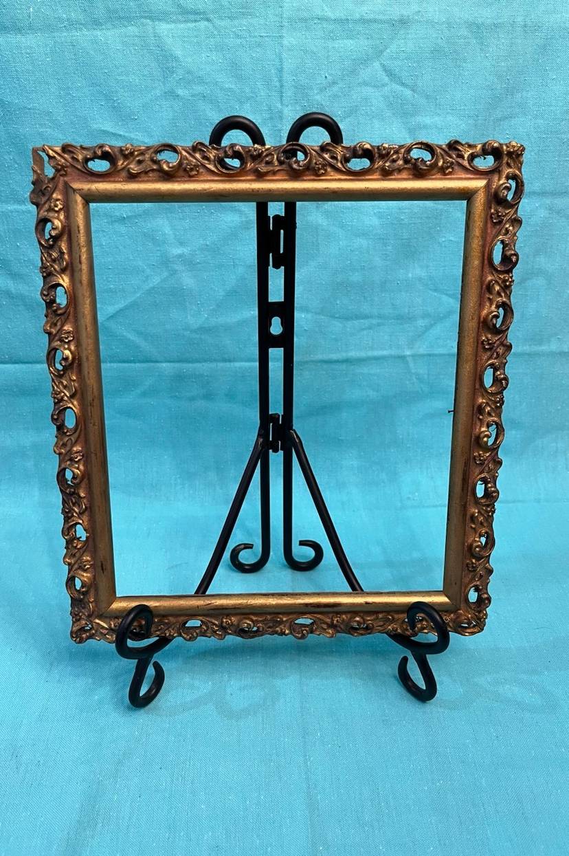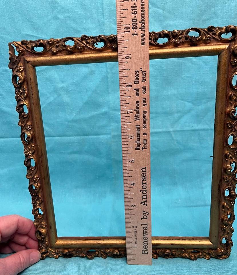 #822 Beautiful light weight Vintage Ornate Wood Gold Tone Frame. Outside frame measures 8.75” x 9.75”. Inside measures approximately 6.75” x 7.75”. NO BACK PIECE.