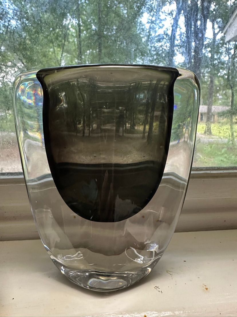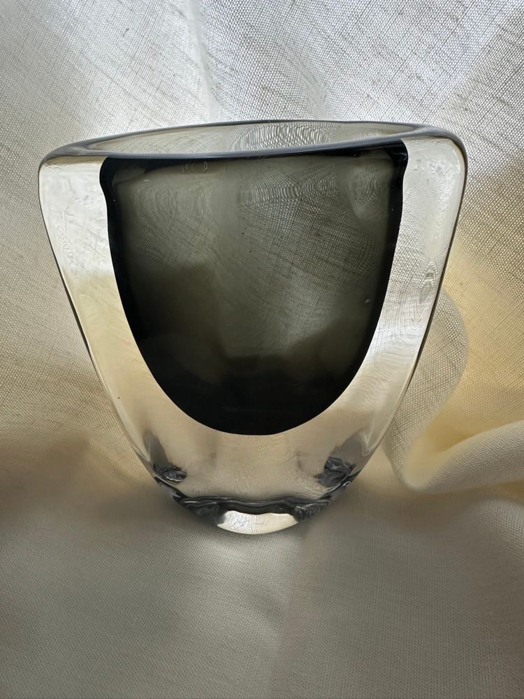 NEW PRICE!! SINCE LISTING THIS I HAVE DISCOVERED SOME SMALL SCRATCHES/MARKS ON THE GLASS. I WILL POST PICTURES. The SIGNED Vintage ORREFORS Nils Landberg Sommerso Vase in Dusk Gray is a stunning piece of Mid-Century Modern art glass from Sweden. Standing at 5" tall, this original hand-blown vase features a glossy finish and an abstract design typical of the era. Crafted by renowned brand Orrefors in the 1960s, this vase is a unique and elegant addition to any decorative display, showcasing the beauty and craftsmanship of mid 20th-century glassmaking techniques.