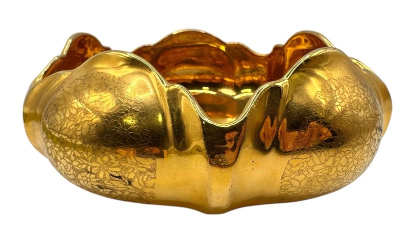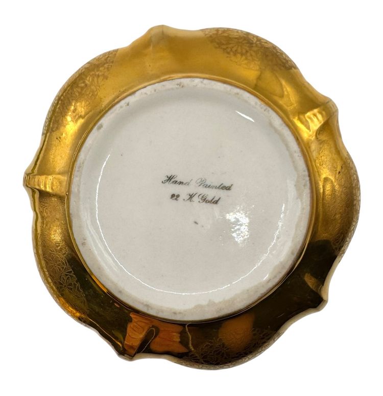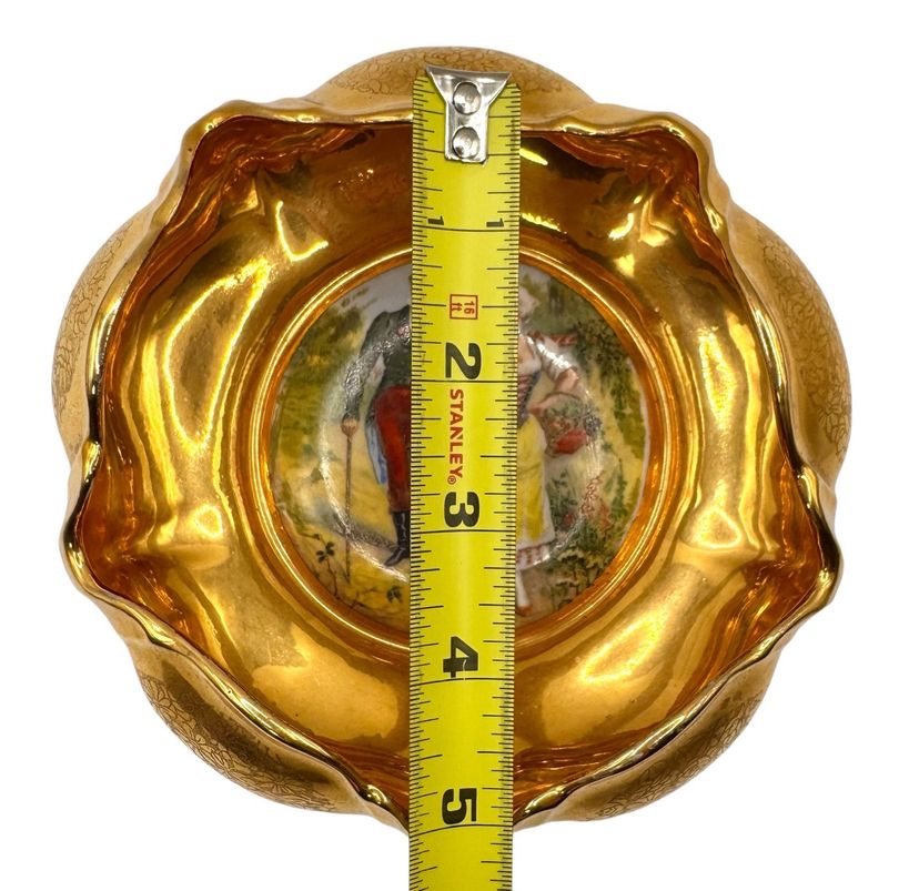 Gilded bowl with a daisy flower design on the outside, and a courting scene on the inside.