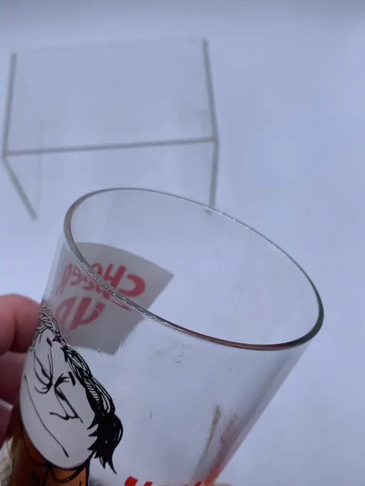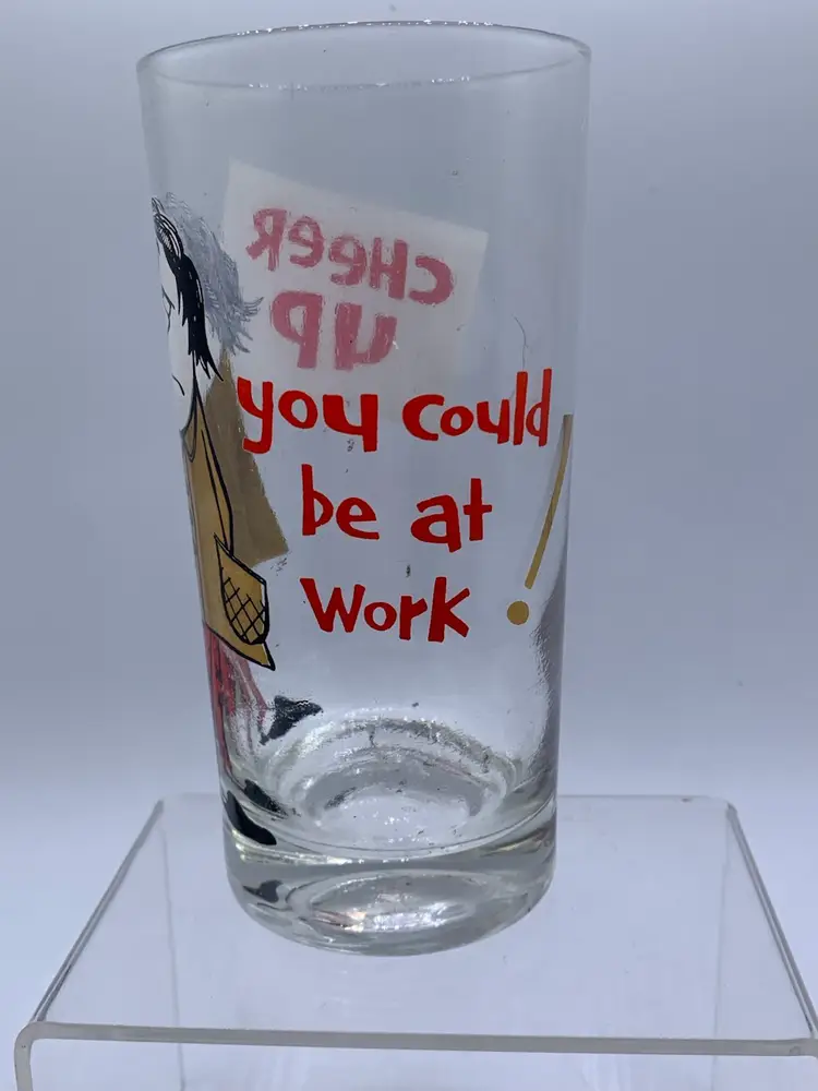 This vintage Osborne Kemper Thomas highball glass features a humorous cartoon design from the 1950s with the phrase "Cheer Up You Could Be At Work." The multicolor glass is part of the OKT franchise and showcases mid-century modern style. Perfect for enjoying cold beverages, this highball glass is a fun addition to any glassware collection, adding a touch of adult humor to all occasions. Made of normal glass, this original piece is sure to bring a nostalgic vibe to your drinkware selection.