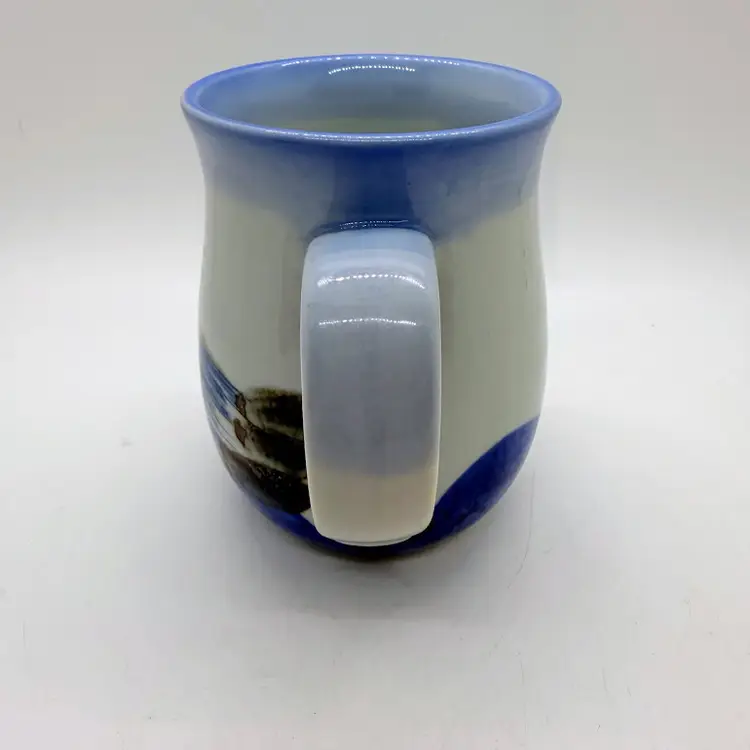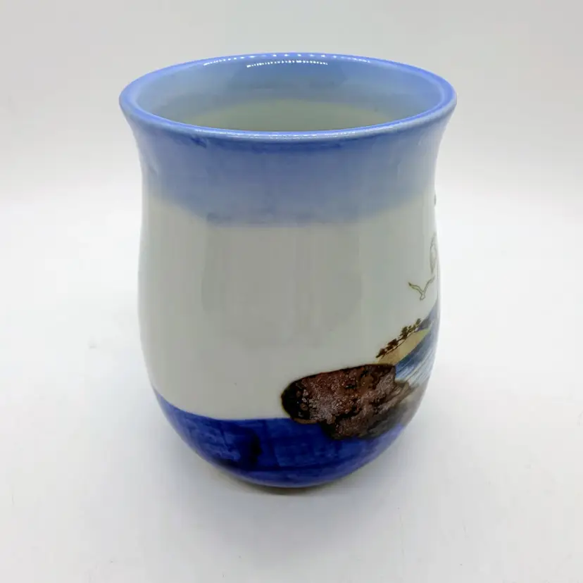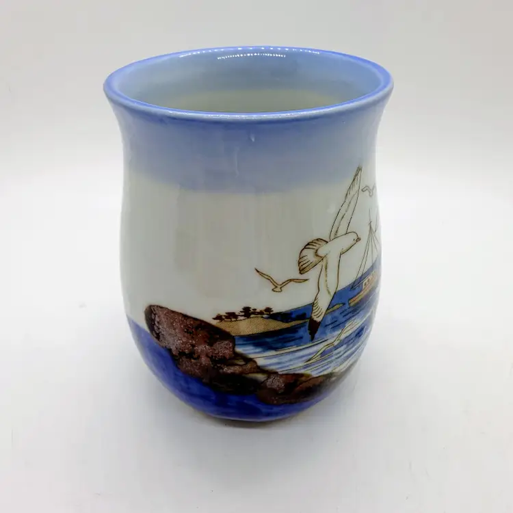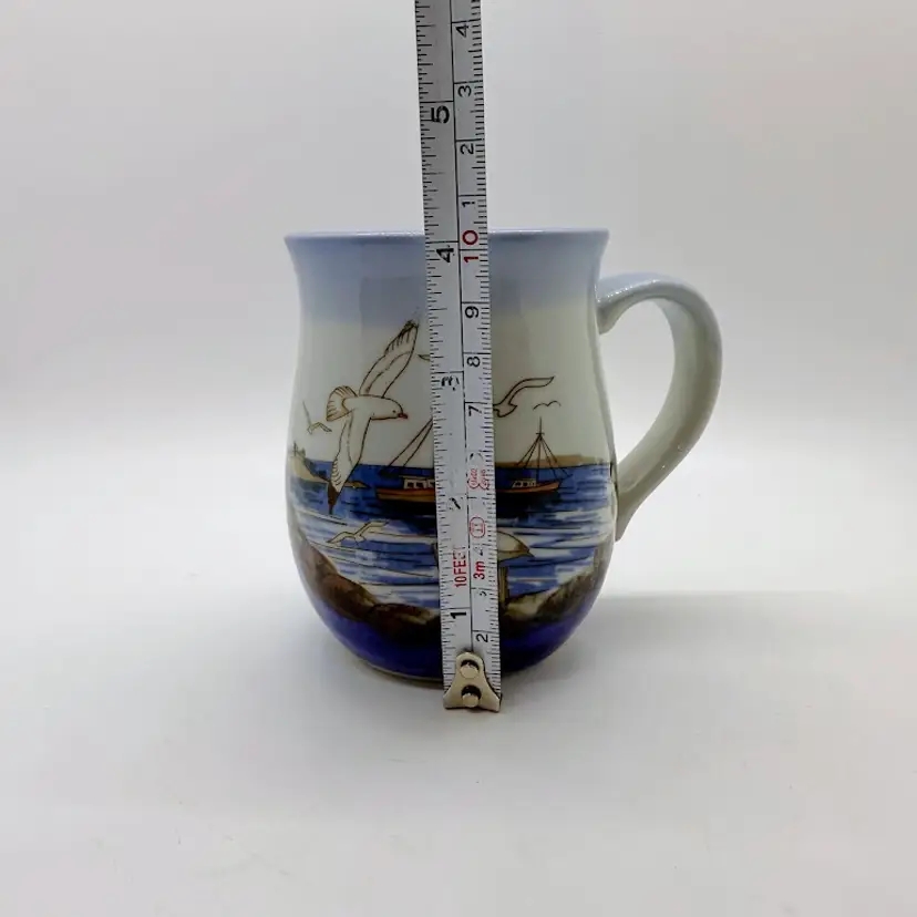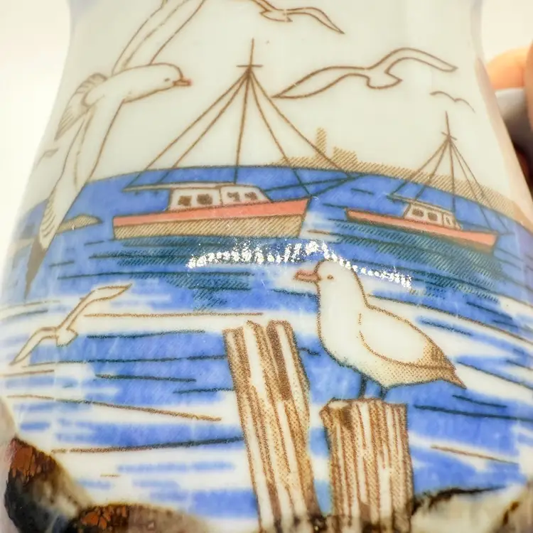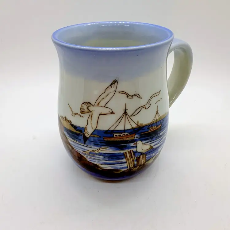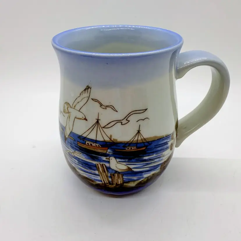 Vintage Otagiri Stoneware Seascape Ocean Scene Coffee Mug with Seagulls & Boats in a Bay/ Pier/ Marina. No chips or cracks. Signs of light wear and use.