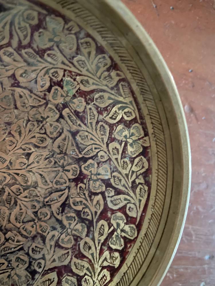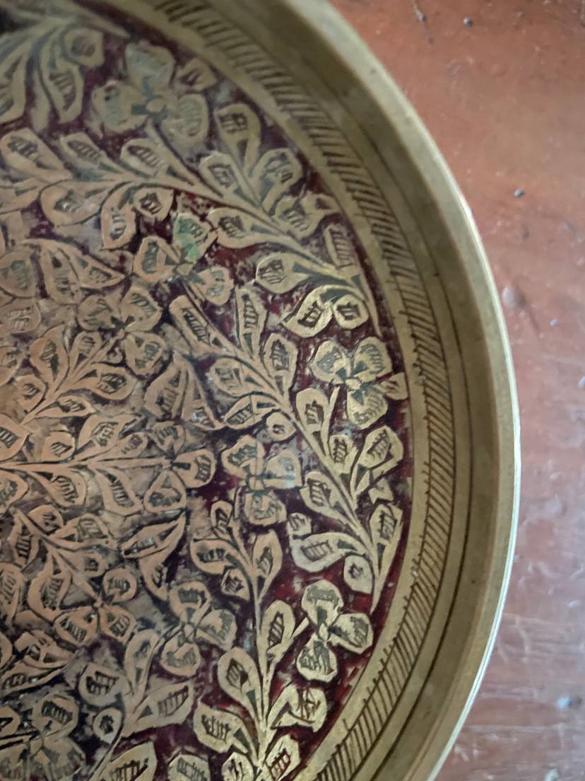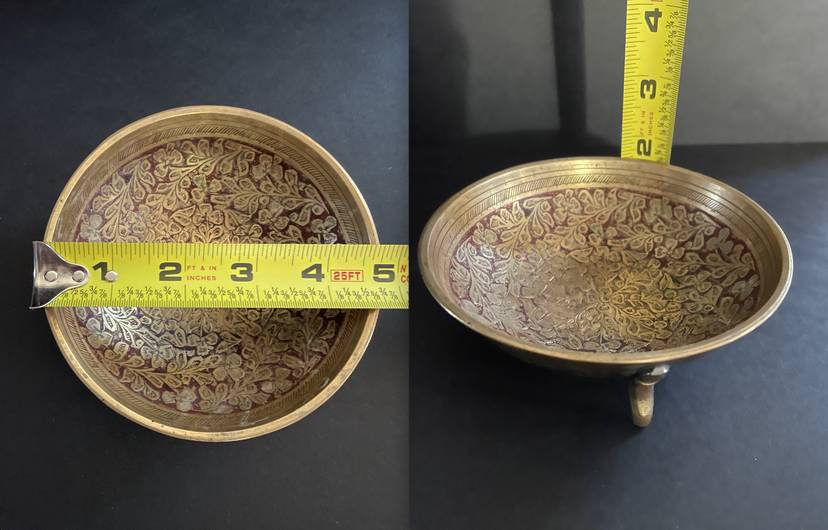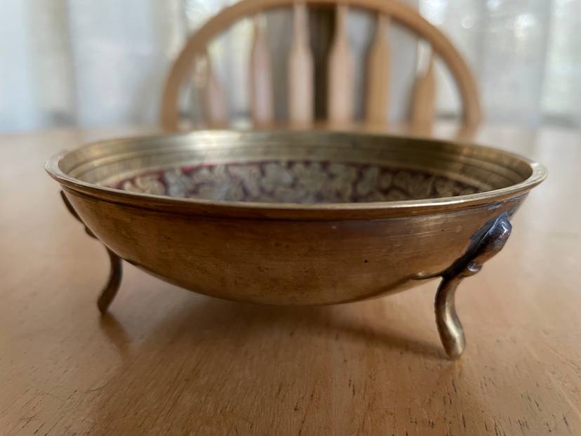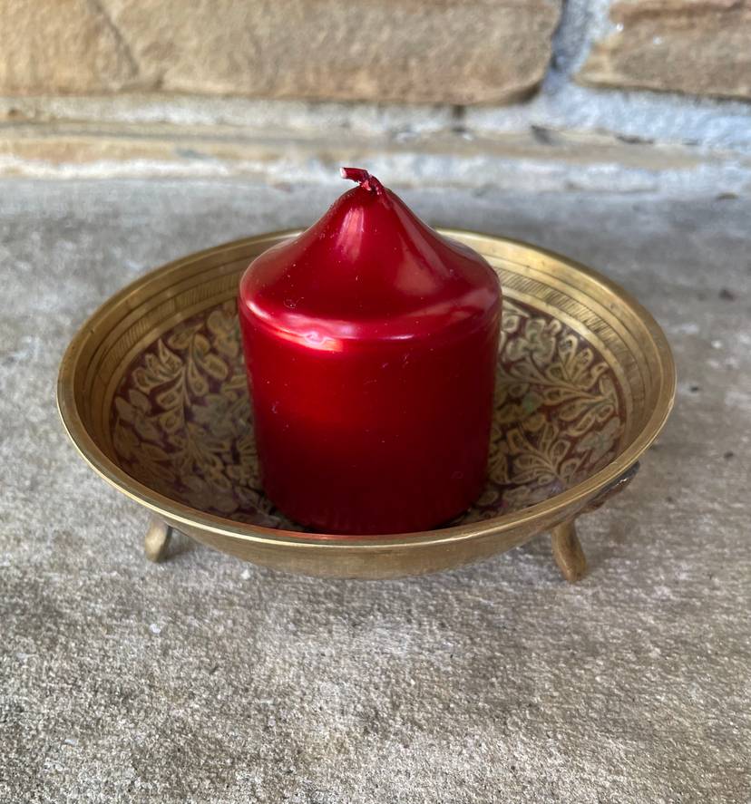 Handsome etched brass dish with red painted design. Stands on 3 brass legs/feet. Small size. Made in India.