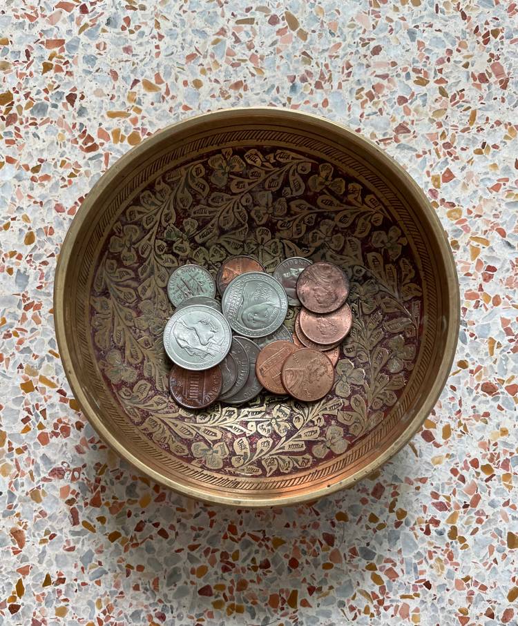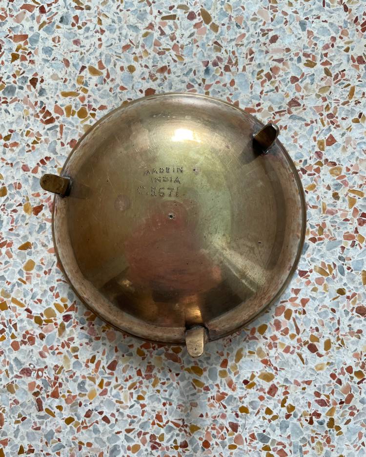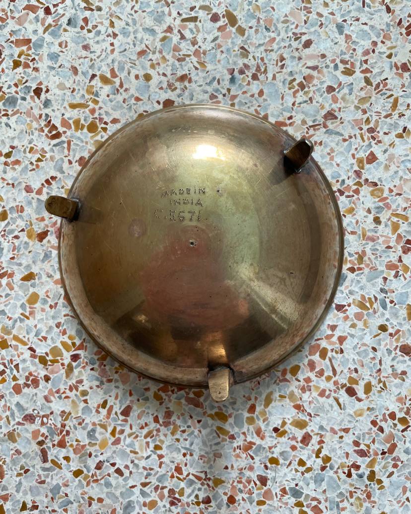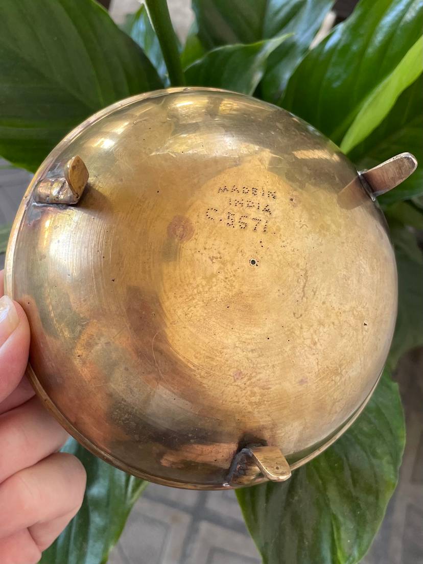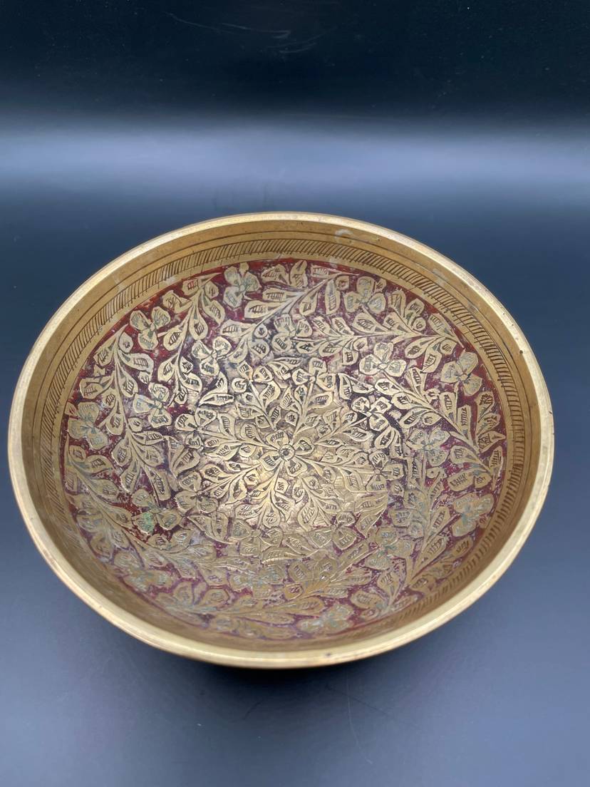 Handsome etched brass dish with red painted design. Stands on 3 brass legs/feet. Small size. Made in India.