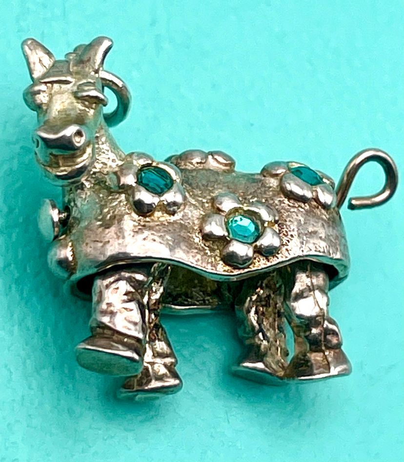 Pictures do not do justices to this incredibly rare and adorable moving/articulating vintage Pantomime horse charm by NUVO. With lovely sea green/blue gems throughout (missing one gem, see photos), it is in otherwise excellent condition with intricate detail and all the parts move smoothly. It is hallmarked "NUVO". It would make a lovely addition to a bracelet or necklace.