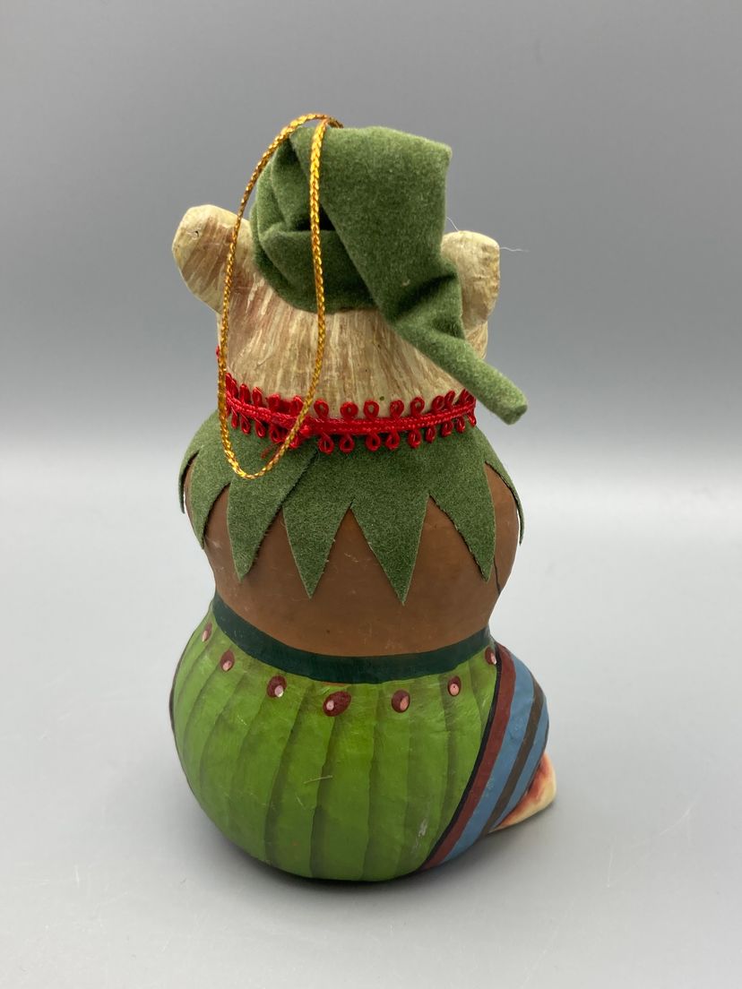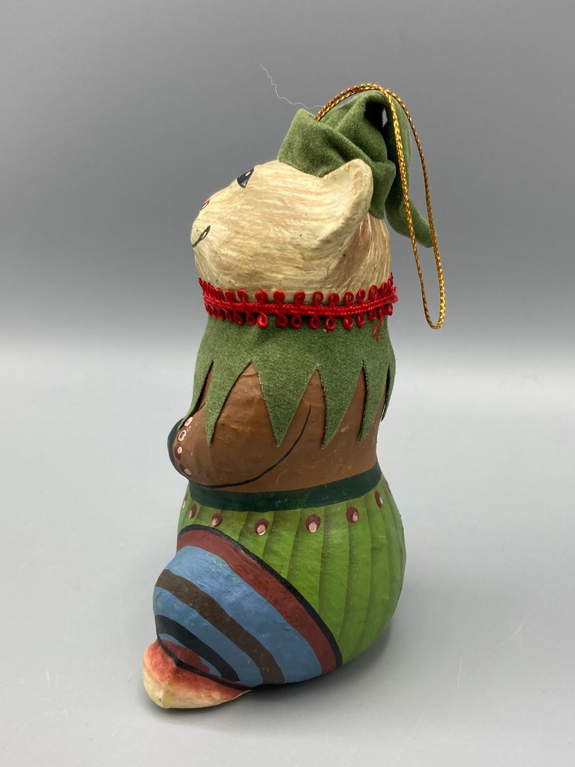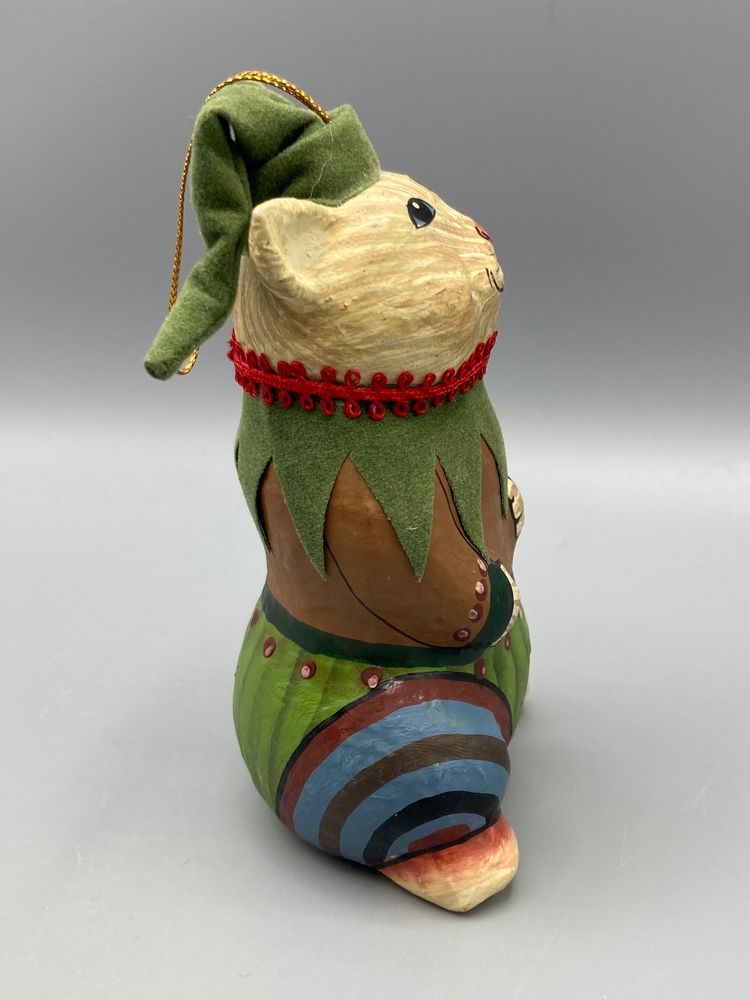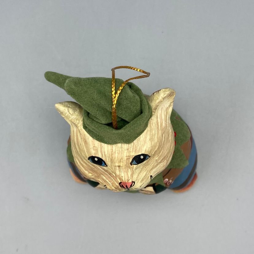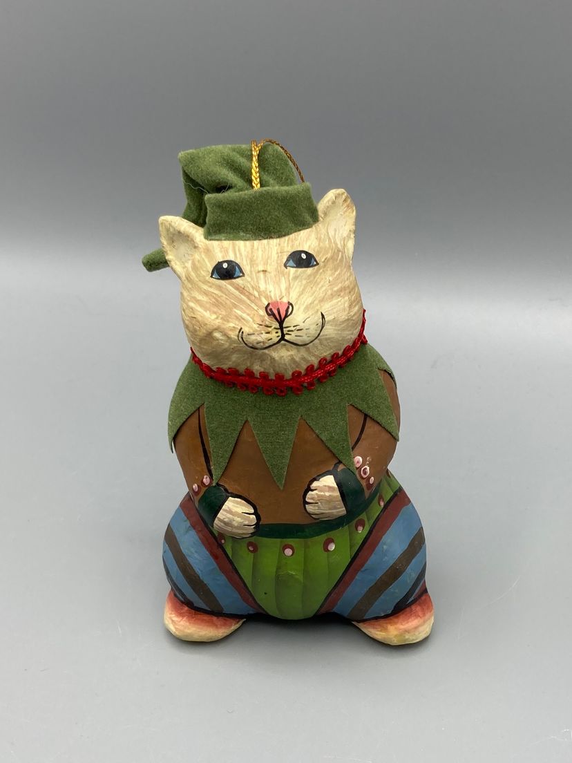 This cat ornament is in good overall condition. It does have some very minor wear to parts of the paper mache. It measures approximately 4 3/4" tall x 2 3/4" wide x 2".