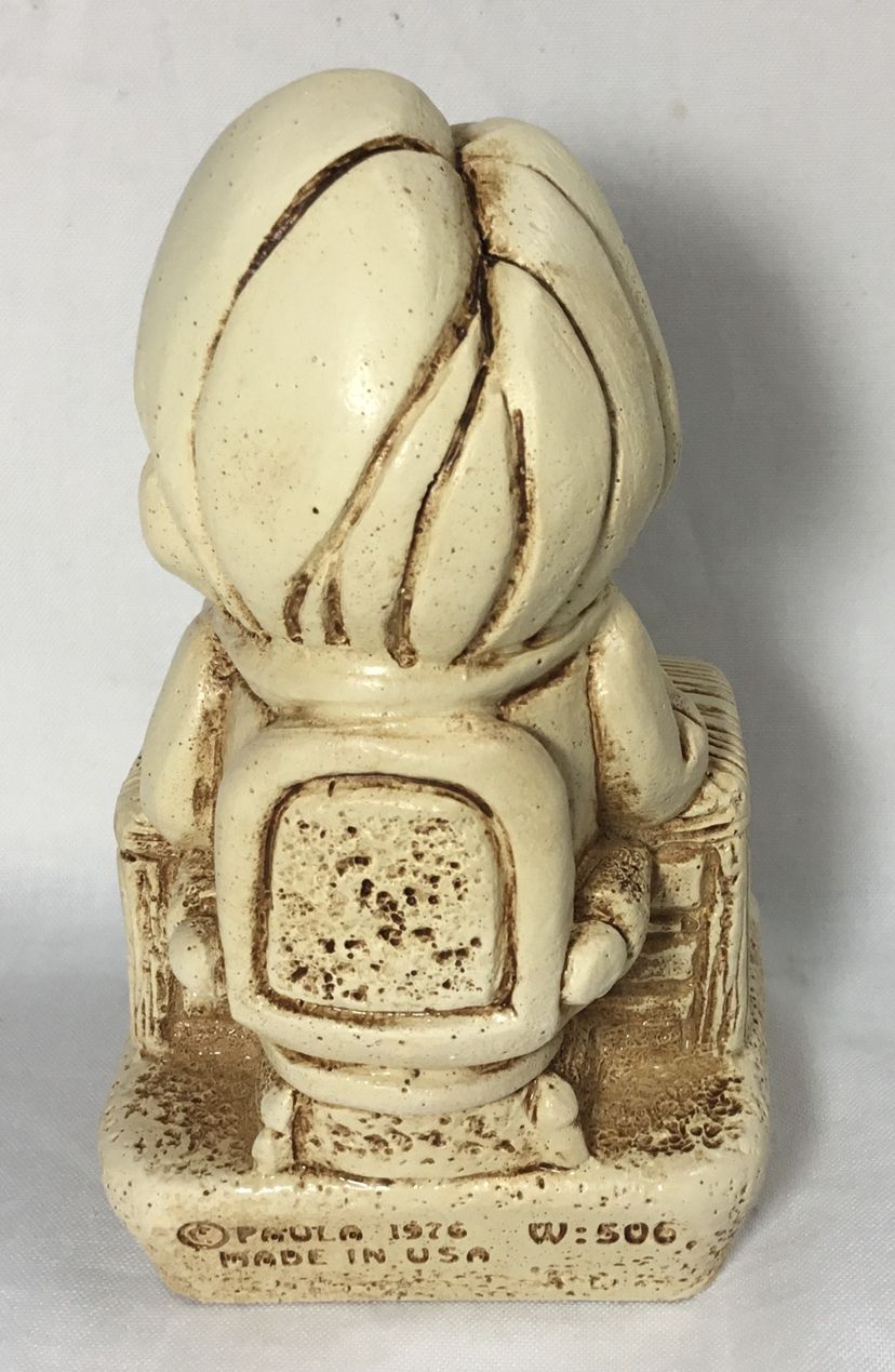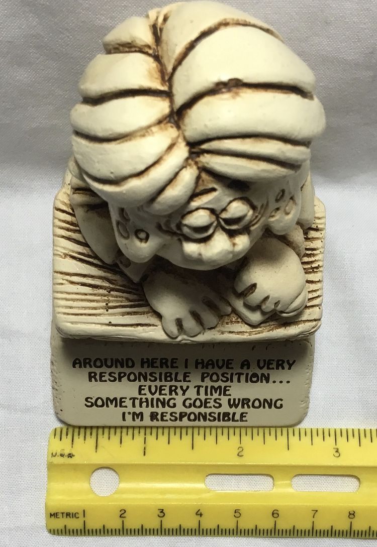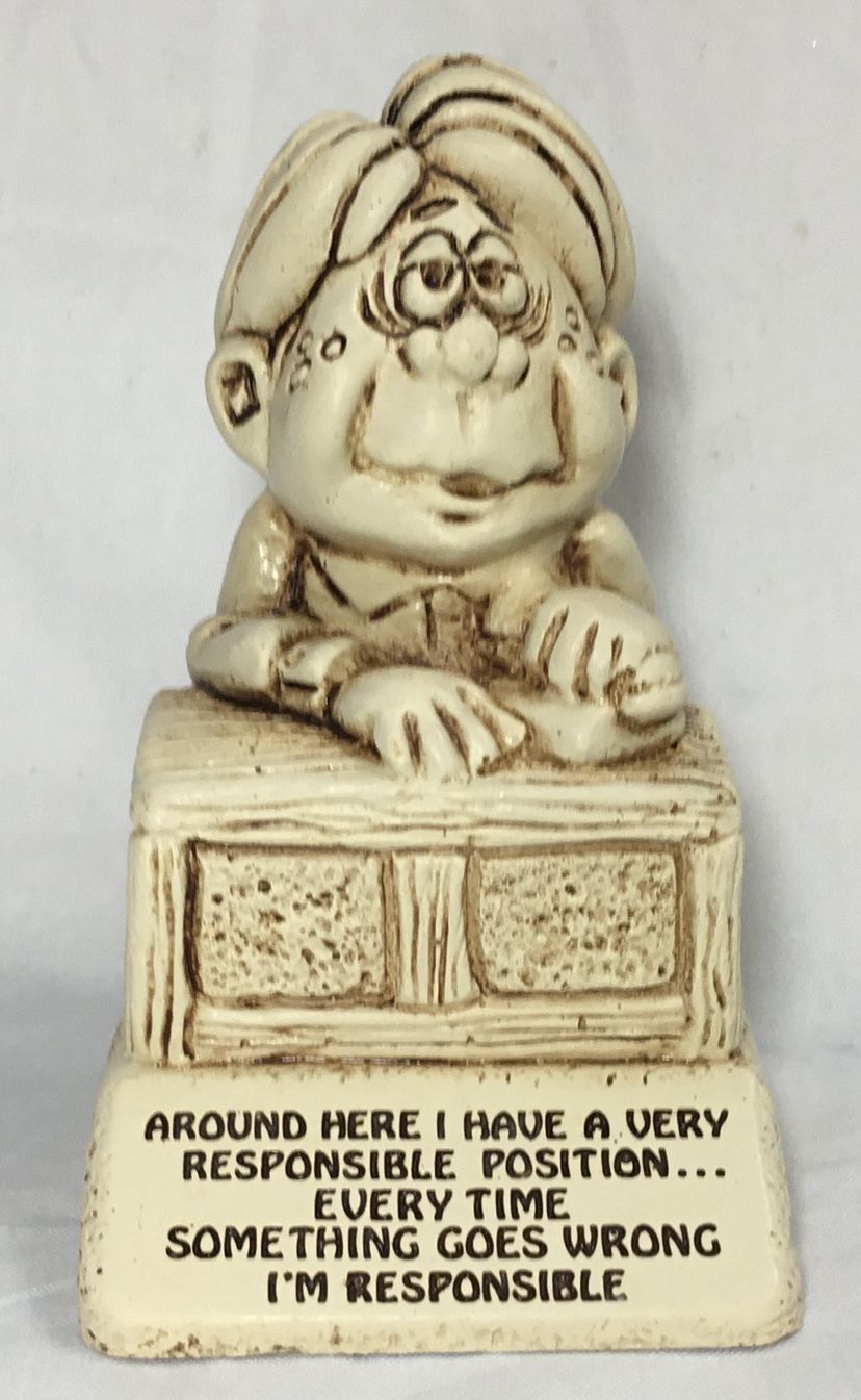 Approx. 4.5 inches tall by 2.5 inches wide by 2.5 inches front to back. Resin figurine in beige resin with dark brown highlights. Man with shirt and tie is sitting at an office desk, his hand on the telephone. Saying on base says. "Around here I have a very responsible position... every time something goes wrong, I'm responsible."