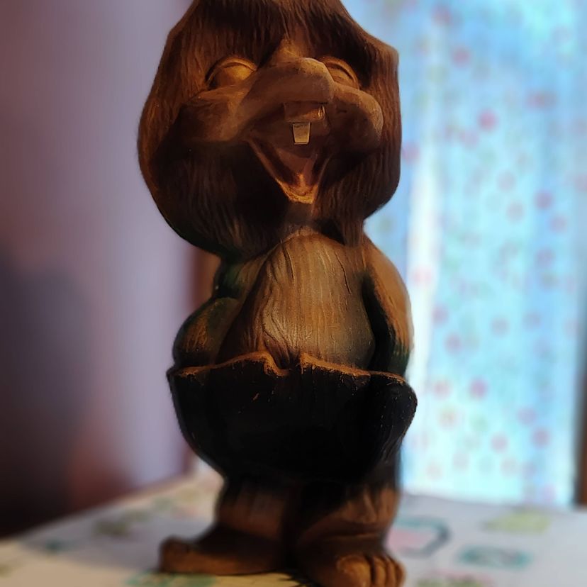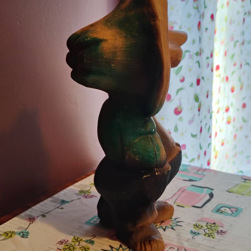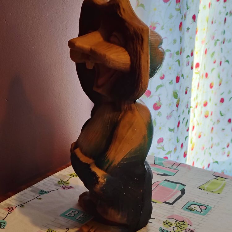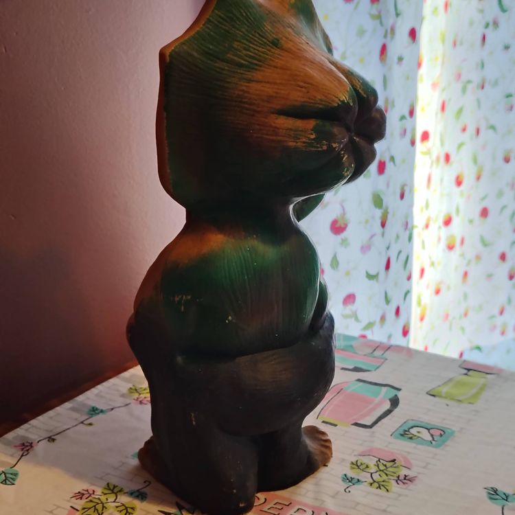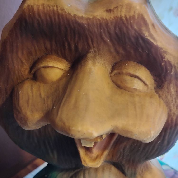 This is a vintage plastic lawn ornament, sure to turn a few heads! Made during the mid 1960s by Union Products Inc, this uniquely charming little fellow was designed by Don Featherstone, of Pink Lawn Flamingo fame. Yes, that flamingo! This troll is reminiscent of its Nordic ancestors and I'd say he even has a touch of the north forest. His texture really does look quite a bit like an old wood carving! His "Pepper Troll" name comes from his hat, which resembles the underside of a green pepper. Condition: This troll is in Excellent shape! His colors are bright and he has very little scratching or wear overall. His plastic is still sturdy, without cracking or any signs of sun damage. He's ready to be enjoyed, inside or outside, for many years to come! Size: This fun little fellow measures about 5" across, is 5" wide, and stands just under 13" tall.