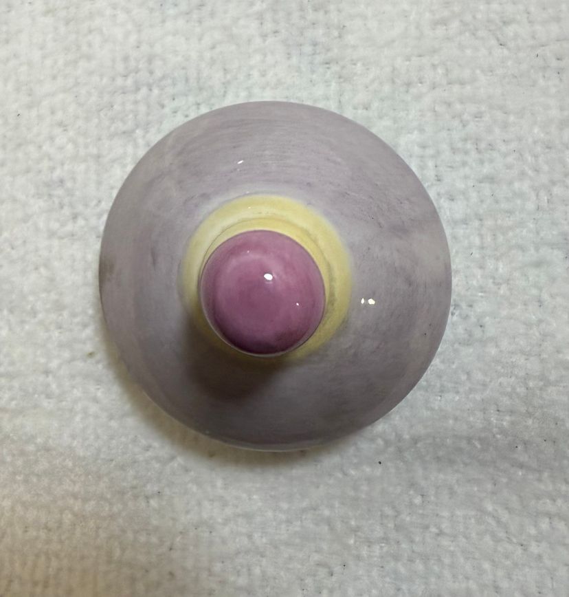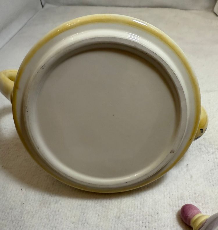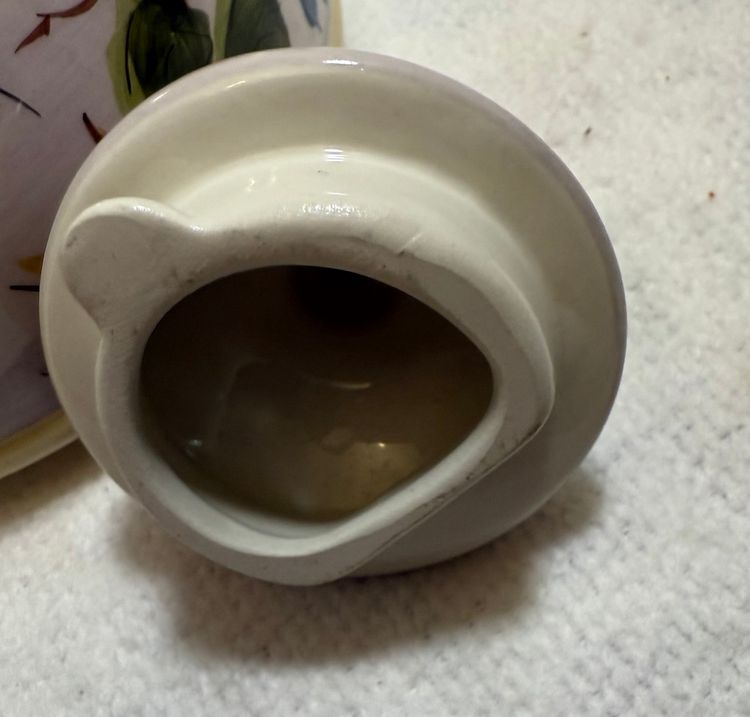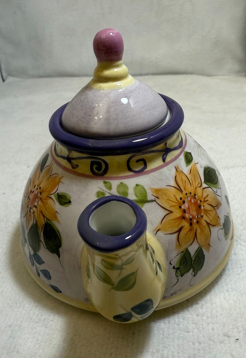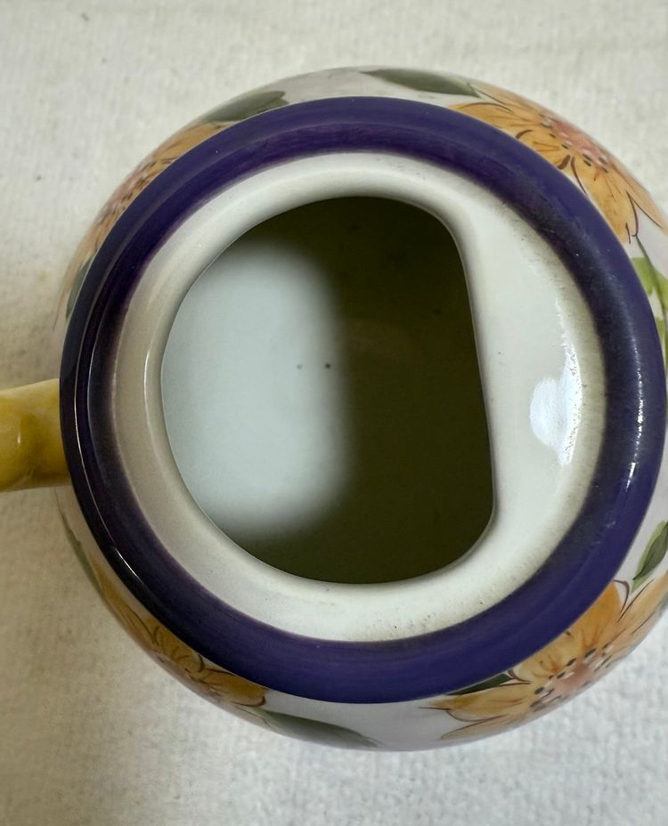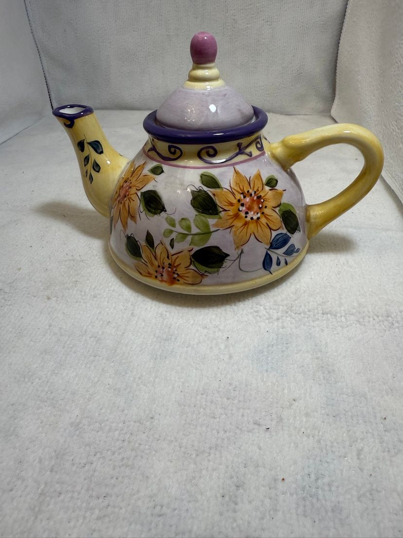 Charming ceramic teapot featuring a floral design. Accented with yellow and purple colors. Small artistic, teapot. beautiful hand painted. There are no chips, cracks or stains beautiful condition. Measurements top of the tea cup is 21/4 inches in diameter. The opening itself is one and 1/4 inches the width of the teapot from the spout to the handle is 6 1/4 inches the small pedestal bottom is 3 1/2 inches in diameter. The height of the teapot with lid is 4 1/4 inches beautiful enough for an art deco piece to decorate with.