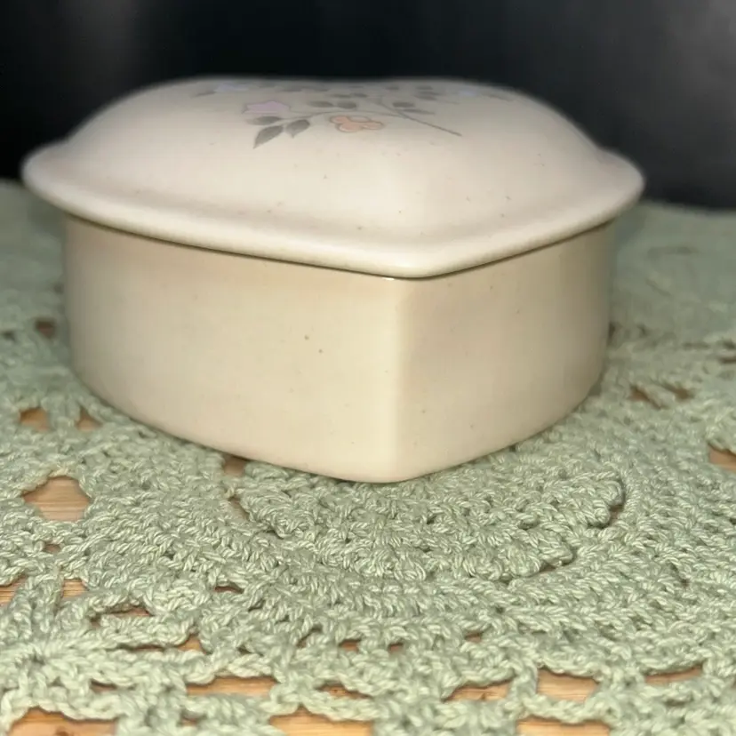 The Remembrance Pattern was introduced and is now discontinued. Dish is 4.25” wide at widest, 3.75” long down the middle, it is 1.75” tall. Excellent condition. No issues.