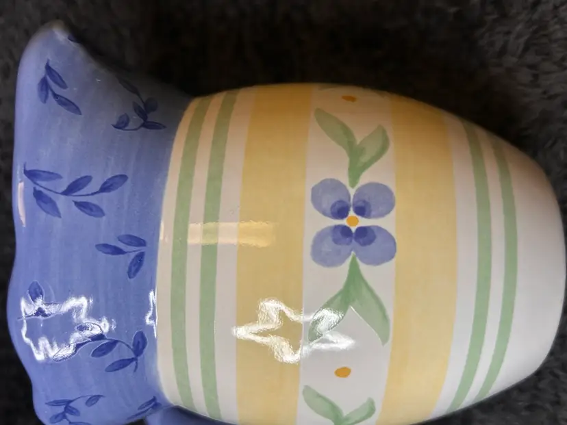 It features a hand-painted design with a blue, scalloped rim, yellow and green stripes, and blue floral motifs.