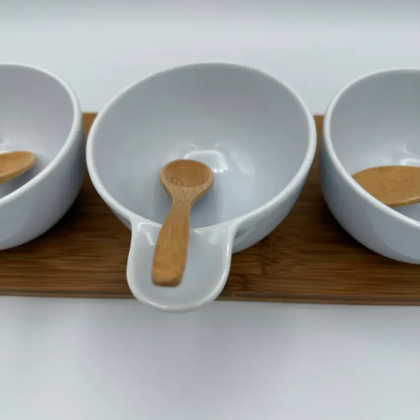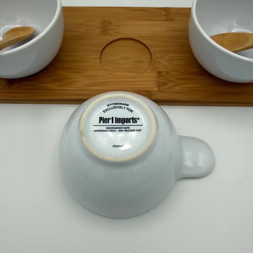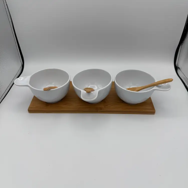 Vintage Pier 1 Bamboo Tray with 3 ceramic white bowls and 3 wooden spoons. Ideal for serving tidbits, dips, sauces, condiments, sundae toppings, snacks, salas, etc. Great Condition. Like New.