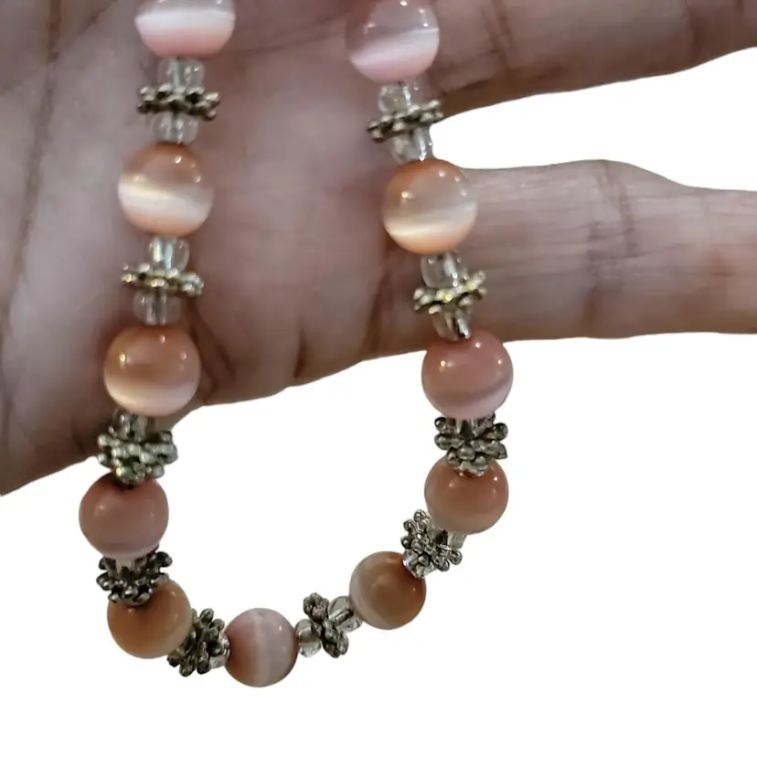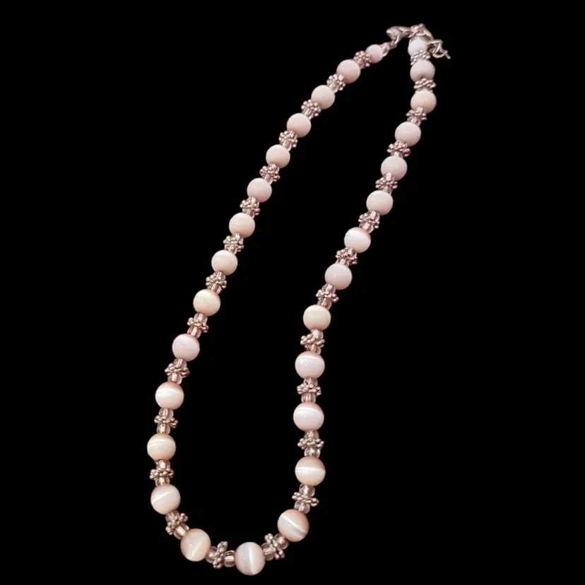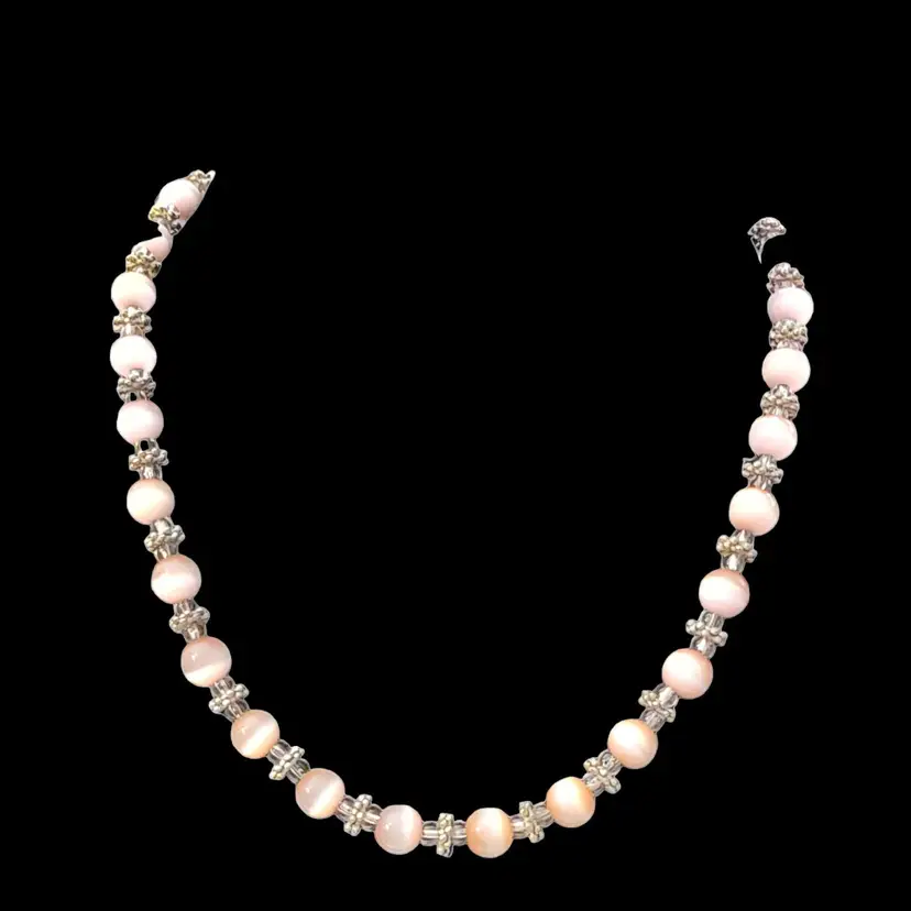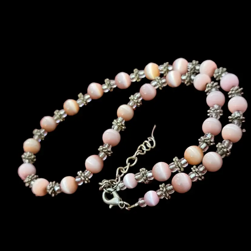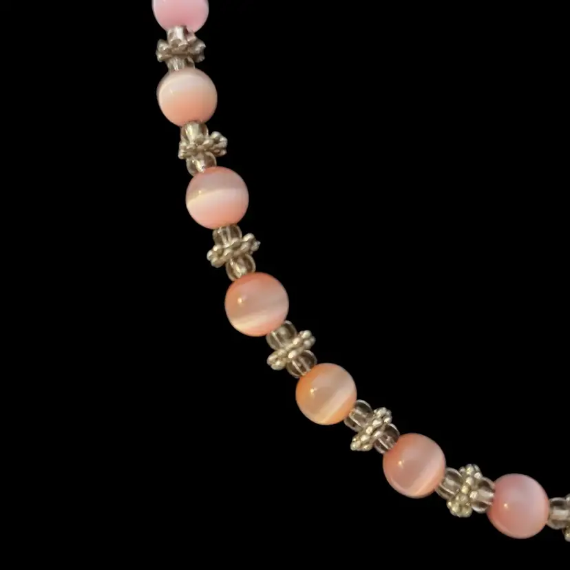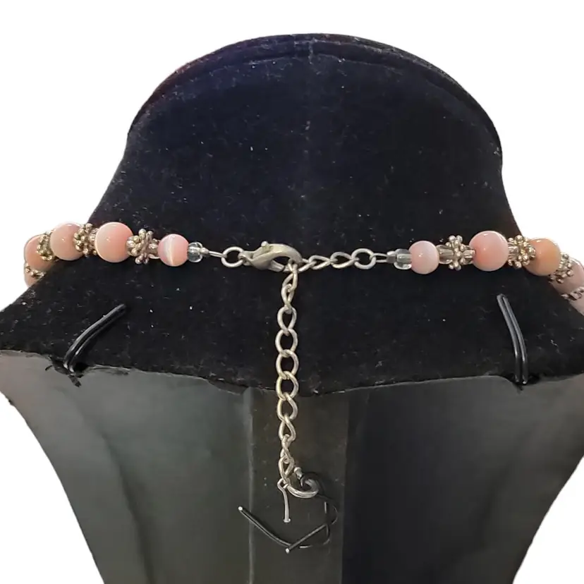 Add a unique touch to your jewelry collection with this vintage pink cats eye glass necklace. The necklace features alternating silver tone metal wheel rondelles and is adjustable to a length of 16" + 2" extender. The lobster closure ensures a secure fit.