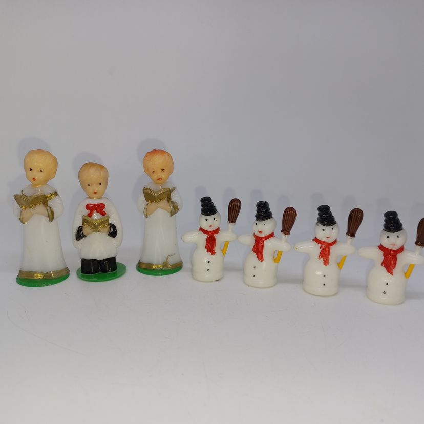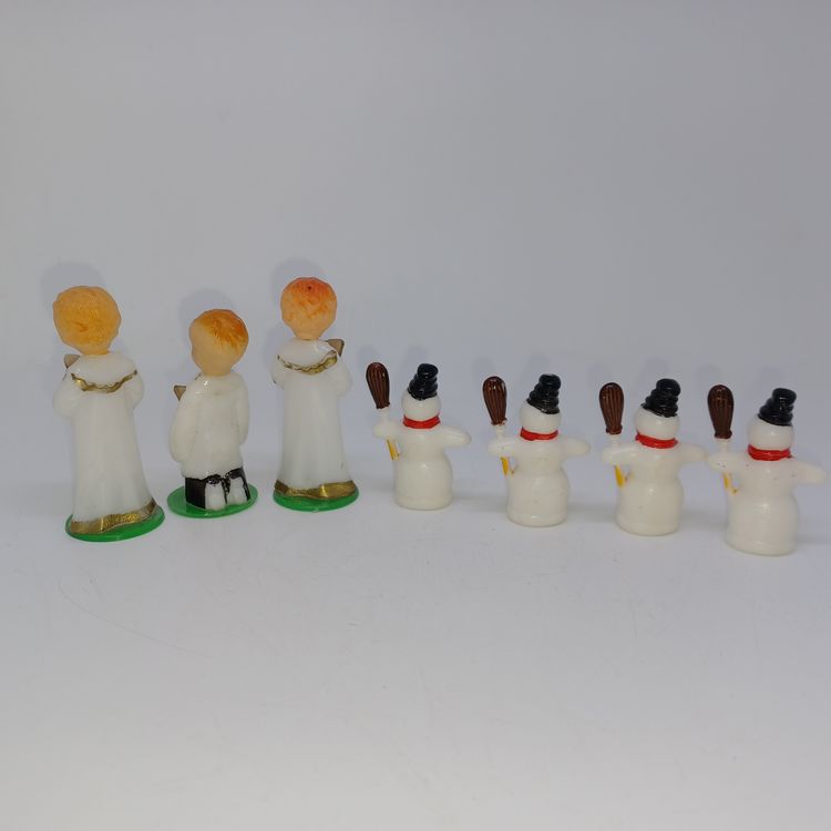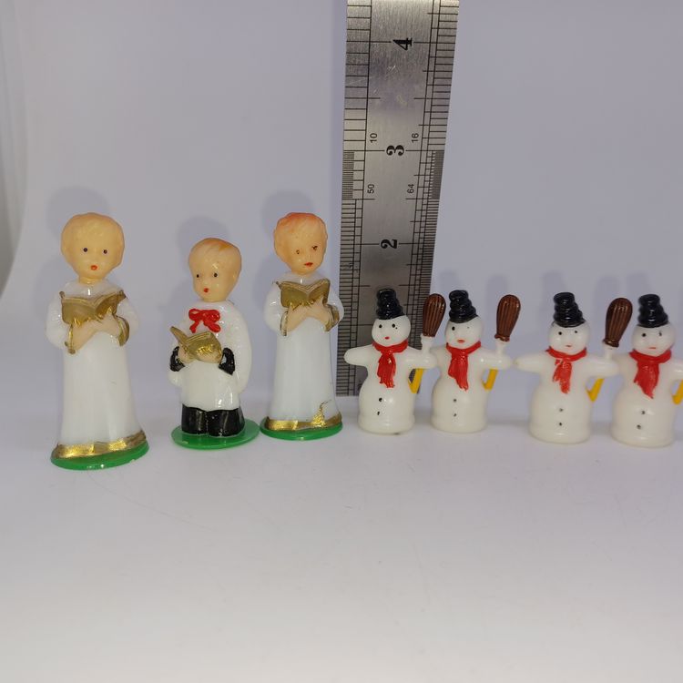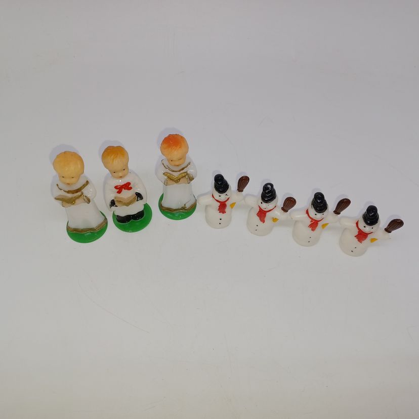 Vintage Plastic Cake Cupcake Toppers chorus figures & snowmen 7 pc Circa 1950s 3 chorus figures 4 Snowman In good vintage condition with no obvious flaws please see pictures as they are the best description all items from a smoke-free home with pets experienced fragile shipper