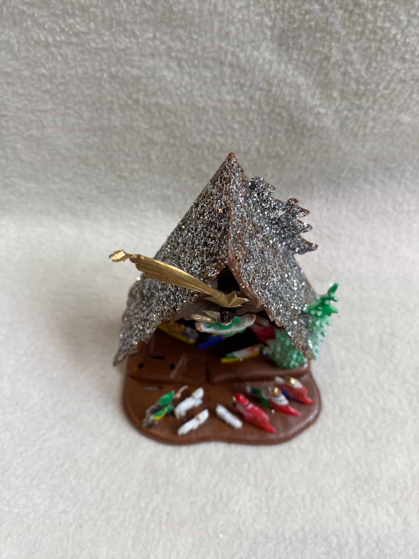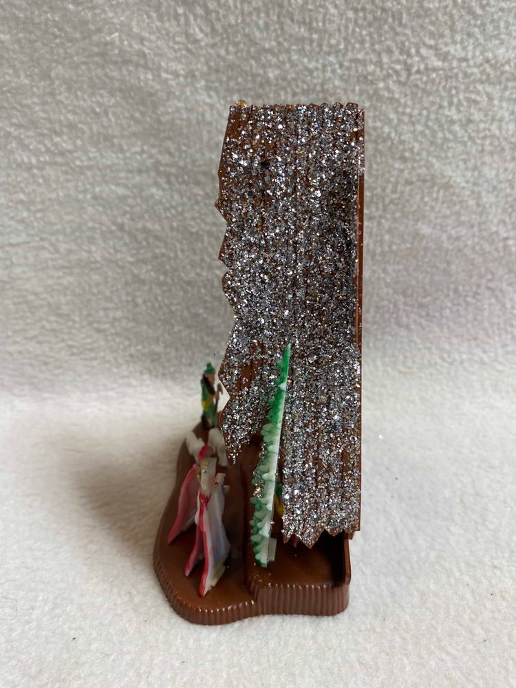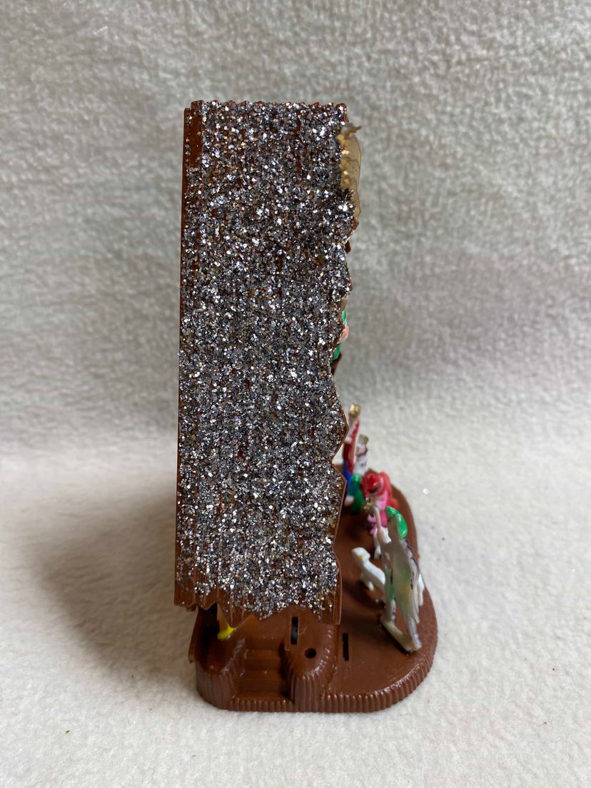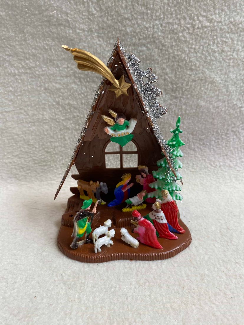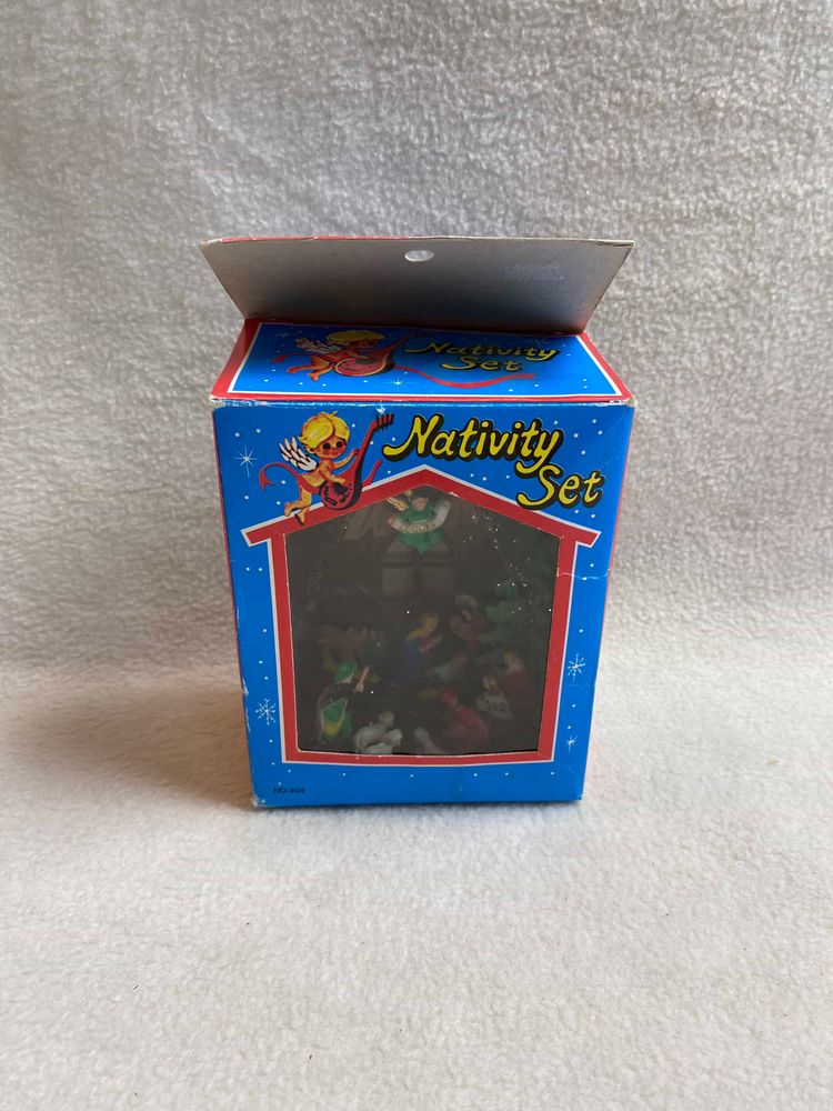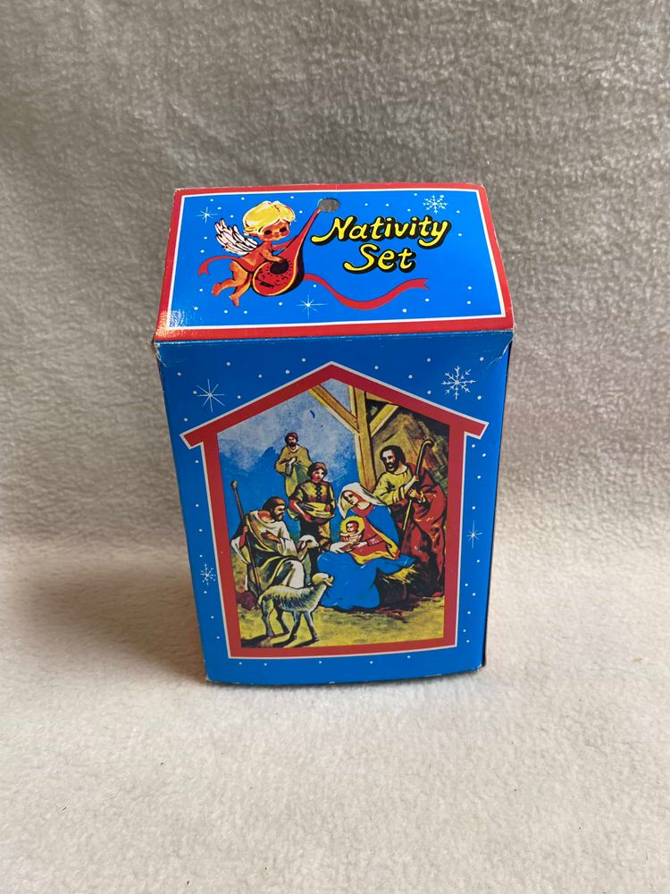 This is a vintage plastic nativity/creche figurine made in China that was found at an estate sale. It appears to be missing two figures to the left of the scene. It comes in the original box. Overall, it is in good condition for its age. It can either sit level or hang on the wall.