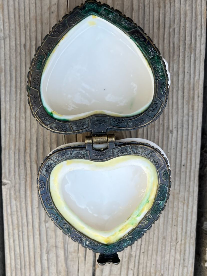A gorgeous Vintage Poinsettias Trinket or Jewelry Box. Heart Shaped. This makes a beautiful gift alone or ad a piece of jewelry or other trinket. Approximately 2 1/2 inches tall, 3 inches wide and 3 inches in depth. Pre-owned. Free of any nis and such.