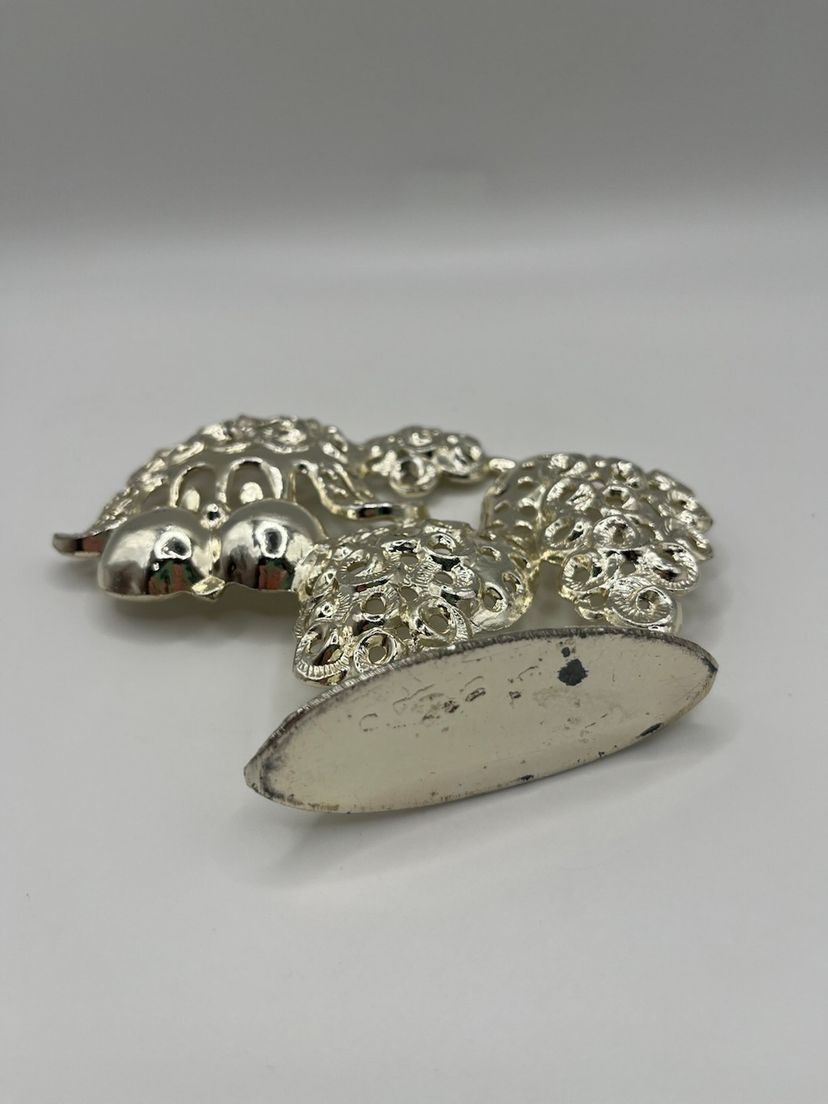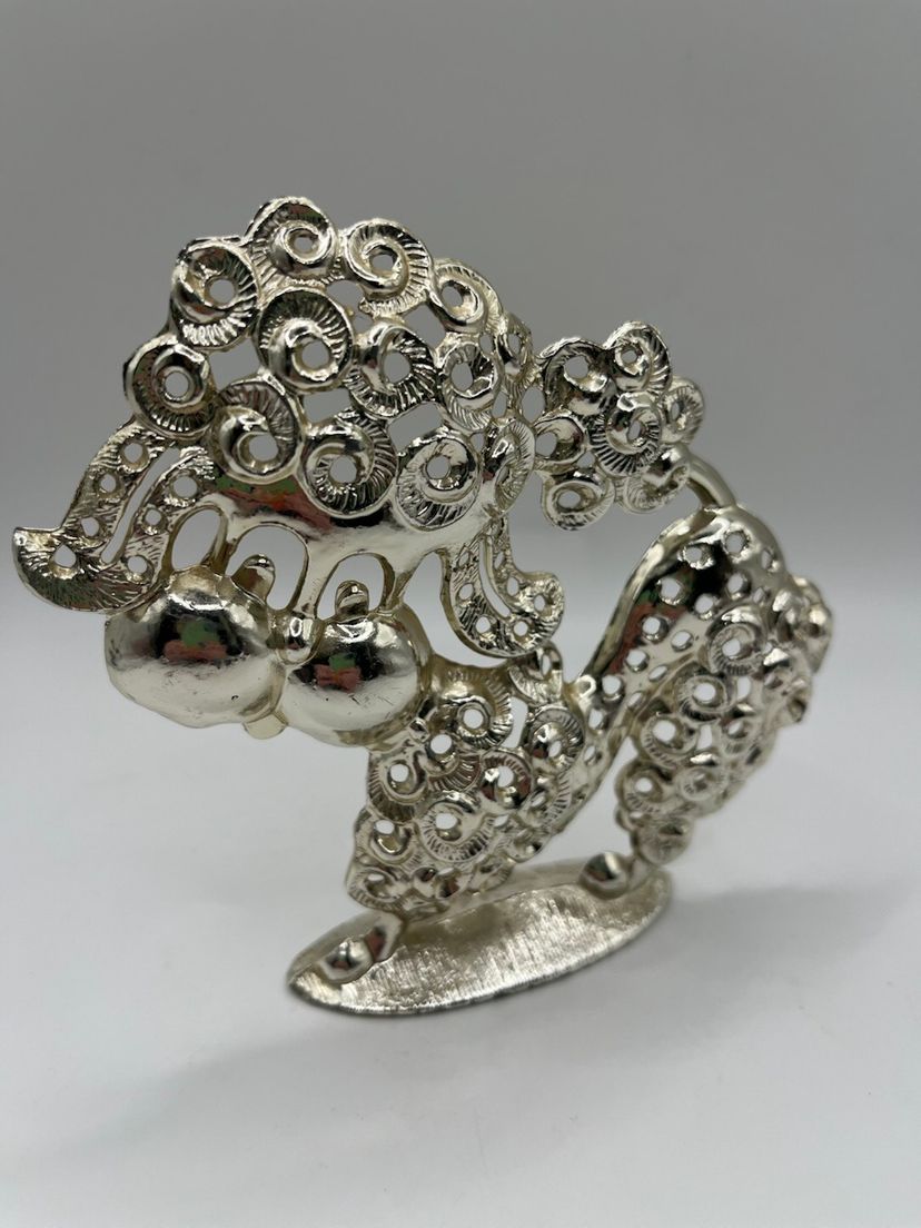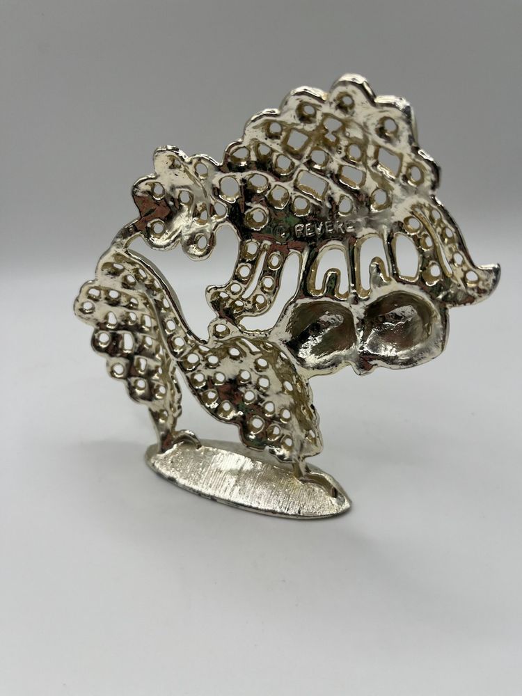 This vintage poodle with curly hair in a playful pose will happily keep your earrings organized. It is silver tones and is approximately 5” tall and wide. Made by Revere marked on reverse. Nice kitschy piece to hold your earrings or just to look at as a figurine.