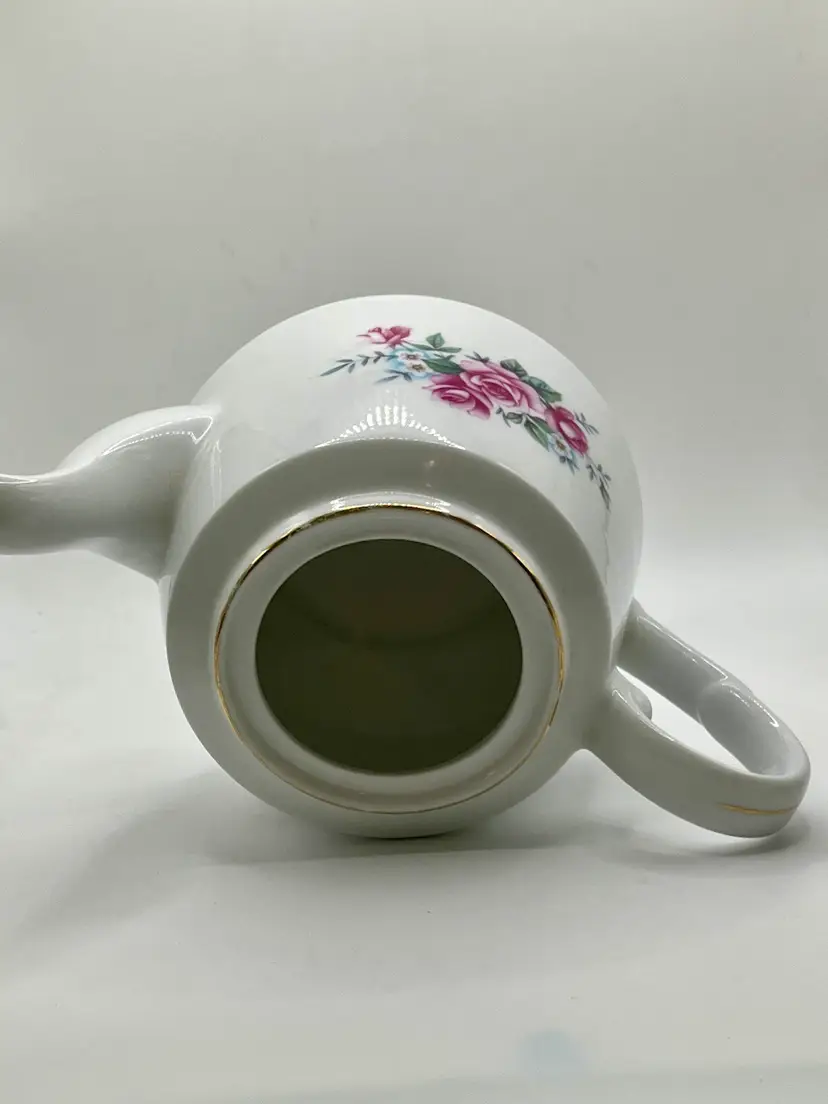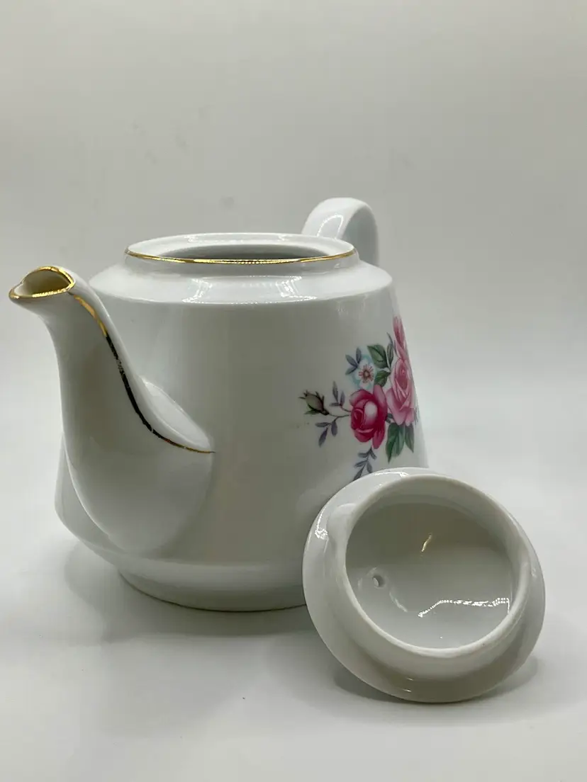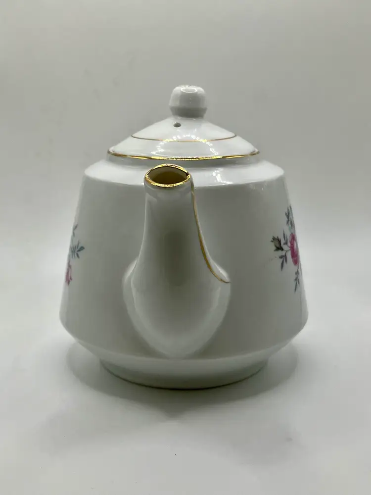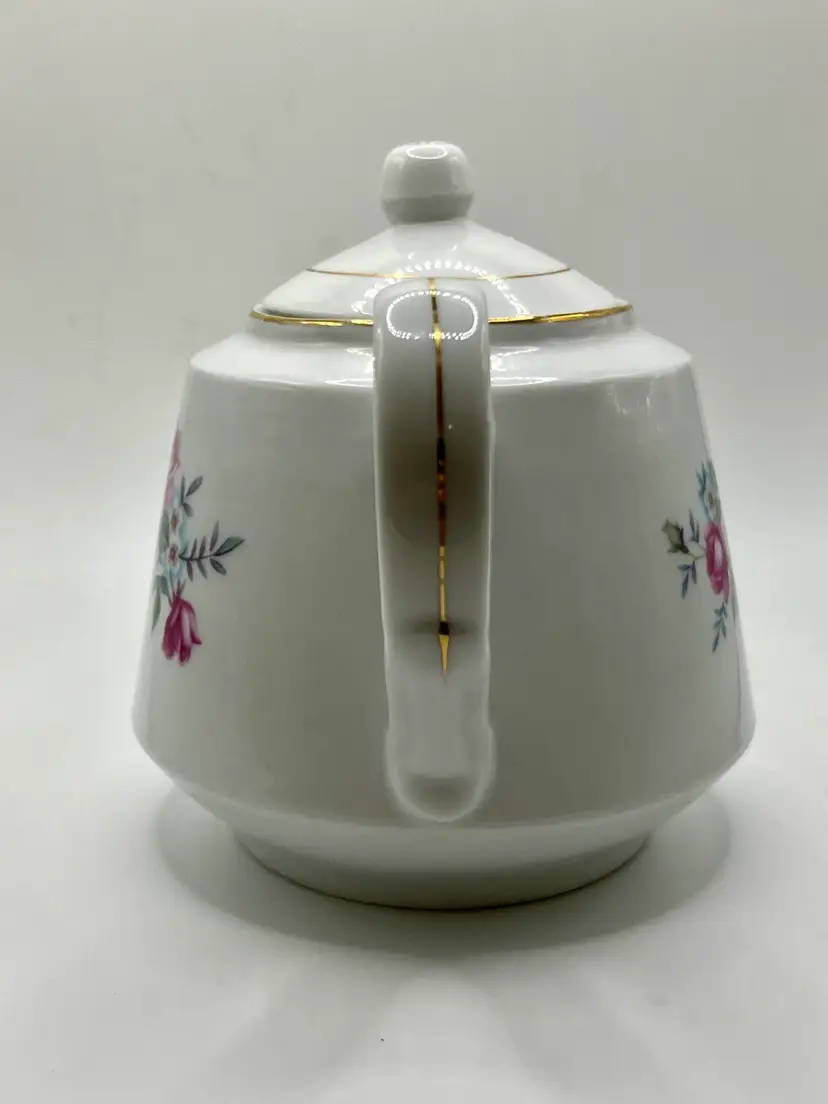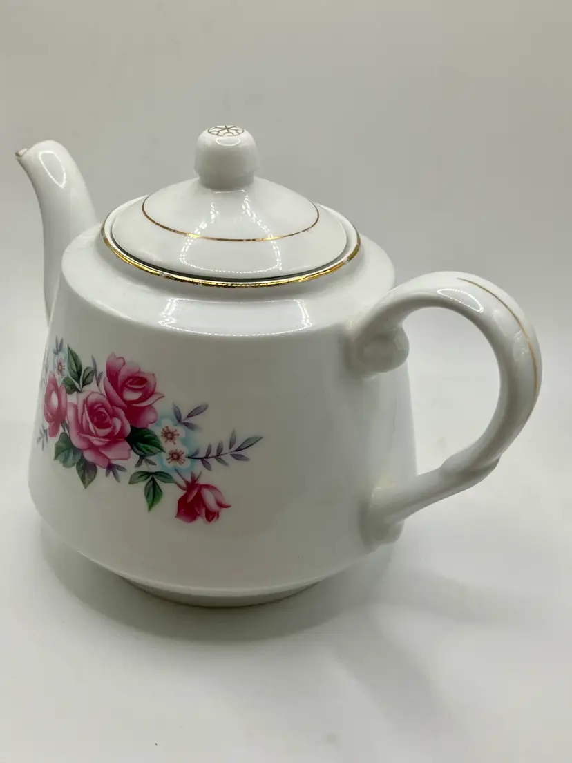 Vintage Porcelain Cabbage Rose Bouquet Gold Trim Teapot China. No Condition Issue. 5”