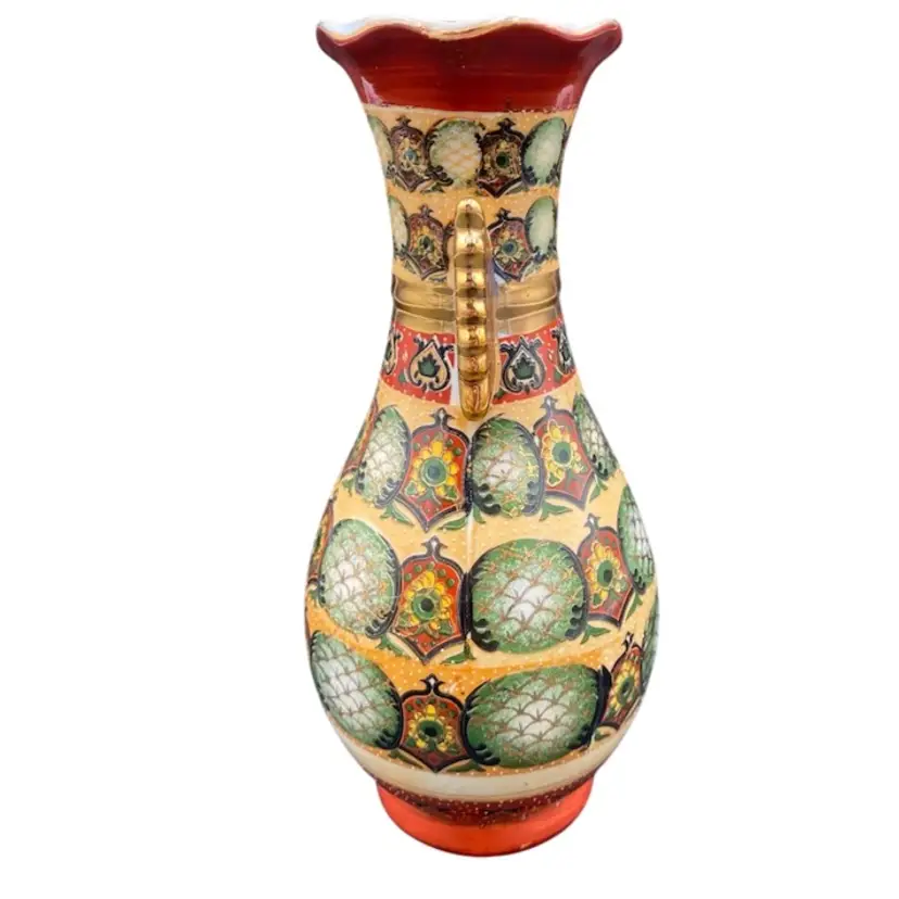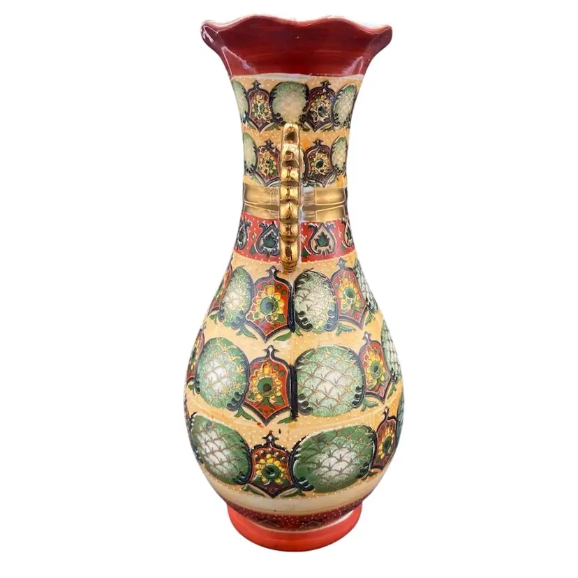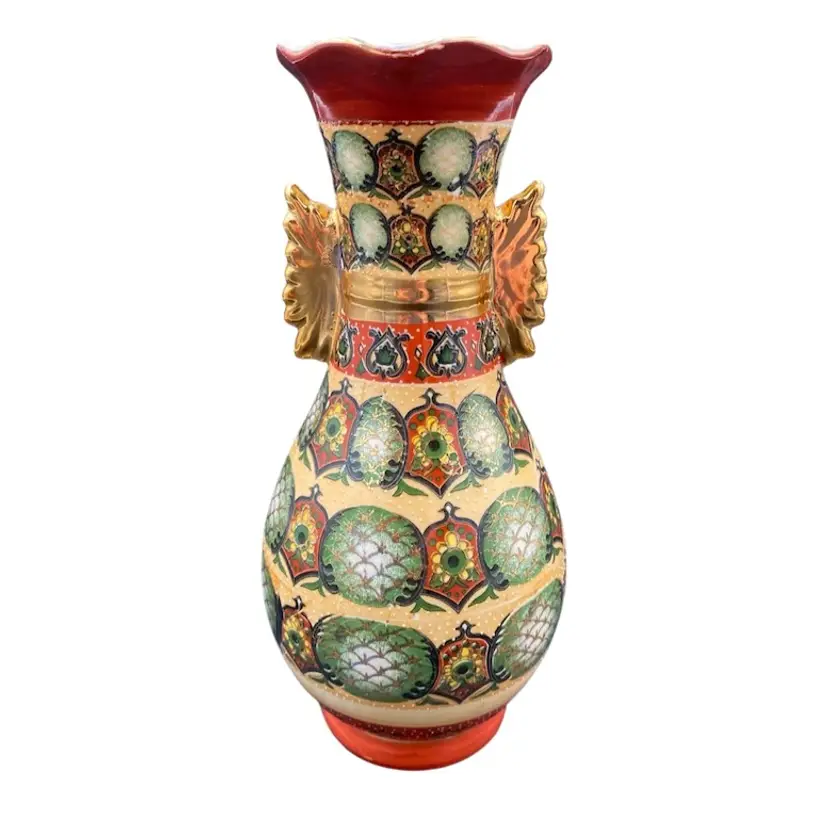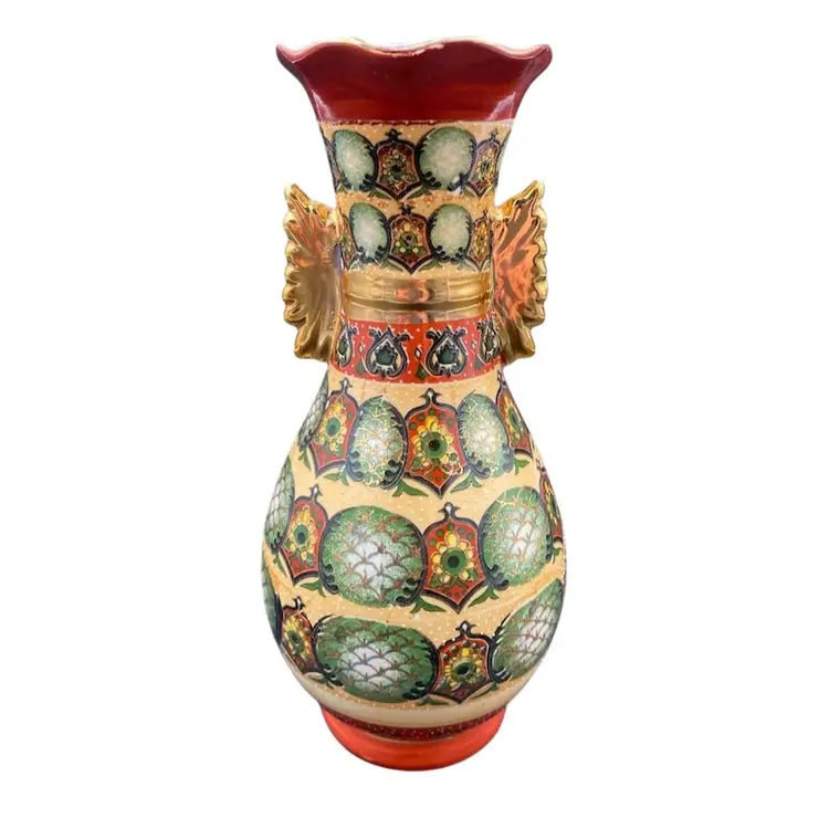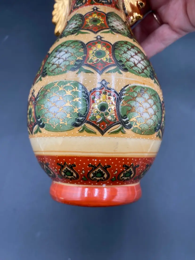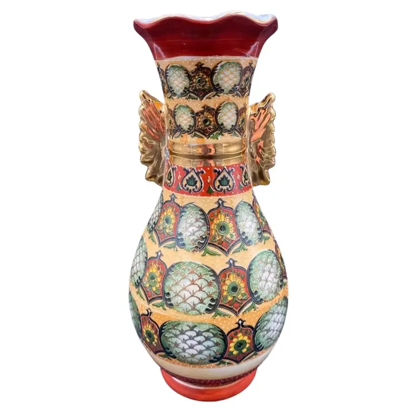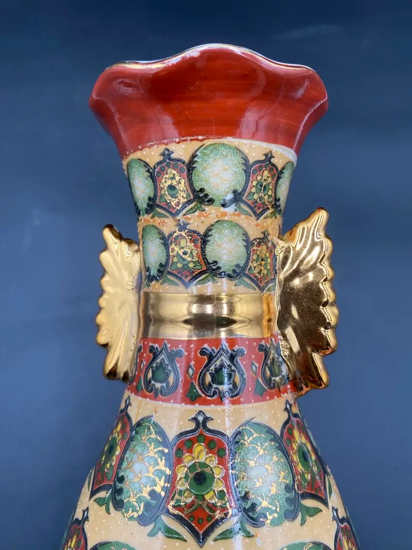This beautiful porcelain vase is a eye-catching addition to any collection. Its unique design features gold painted, wing-shaped, handles and a beautiful red and green abstract pattern against a soft orange background, with gold cloisonne layered over all of it (including the rim of the vase). Measuring 8 inches in height and 3.6 inches in width, this medium-sized, 8.7 ounces vase is perfect for all occasions.