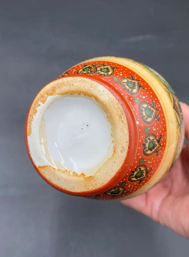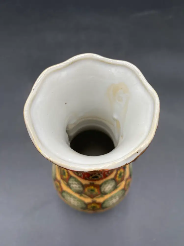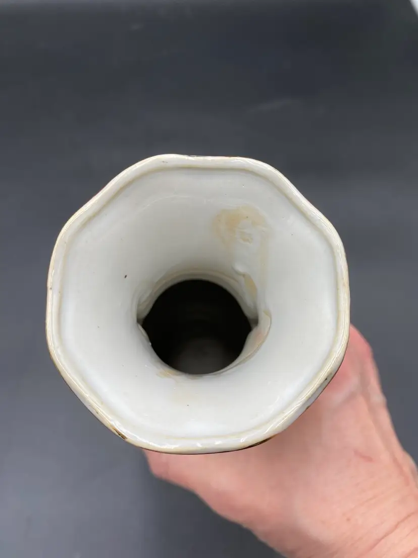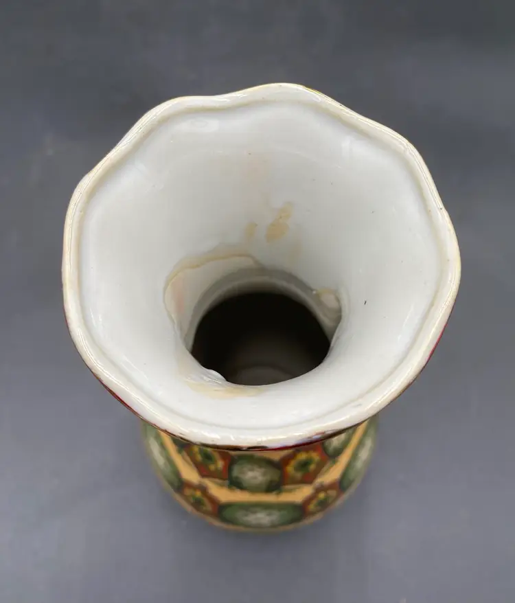 The exterior of the vase is in very good condition. The gold remains vibrant from top to bottom. The interior glaze is uneven, resulting in a "stained" appearance. Please see the pictures for a complete sense of the description. Thank you!