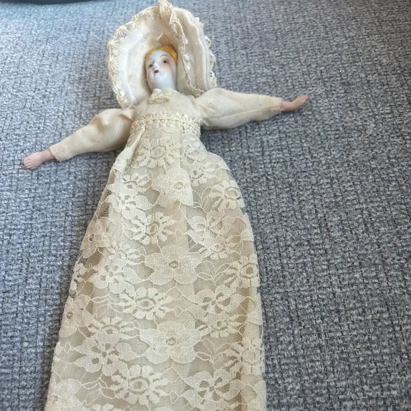 Charming vintage porcelain doll featuring a delicate lace dress and bonnet. Perfect for collectors or as a unique decor piece.