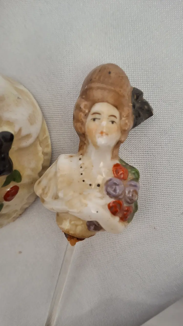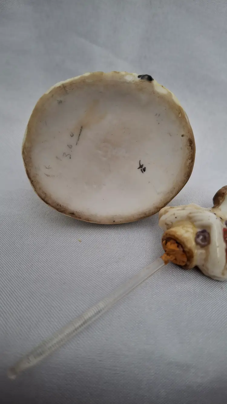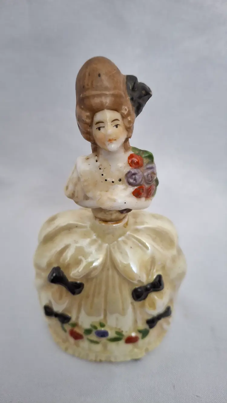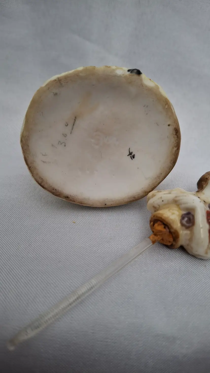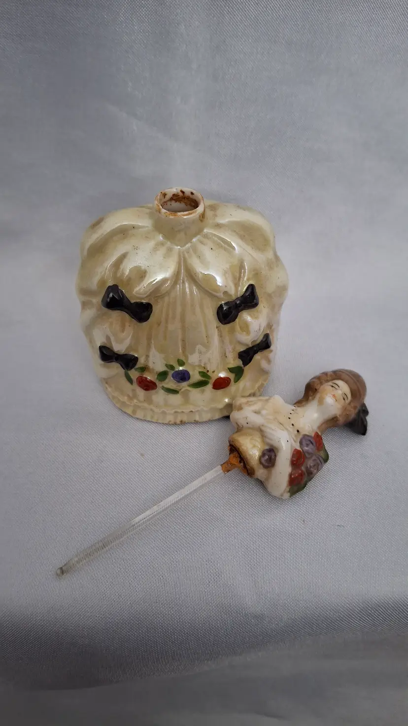 Vintage Porcelain Dresser Doll Perfume Bottle – Madame Pompadour This charming vintage porcelain dresser doll perfume bottle captures the romance and refinement of the 18th century. Standing 4½ inches tall, she wears a pale gown adorned with hand-painted black bows and colorful floral accents. Her serene expression and sculpted hairstyle evoke the grace of the Madame Pompadour era. She separates at the waist to reveal a cork-stoppered glass dauber, though the cork has worn over time and is a bit loose the dauber is intact. The base bears hand-painted numbers, a hallmark of early German porcelain craftsmanship. Despite her age, she remains in good vintage condition—no chips, cracks, or repairs—just gentle patina that adds to her timeless charm. A perfect treasure for perfume-bottle collectors, porcelain-figurine enthusiasts, or anyone curating a romantic vintage vanity display.