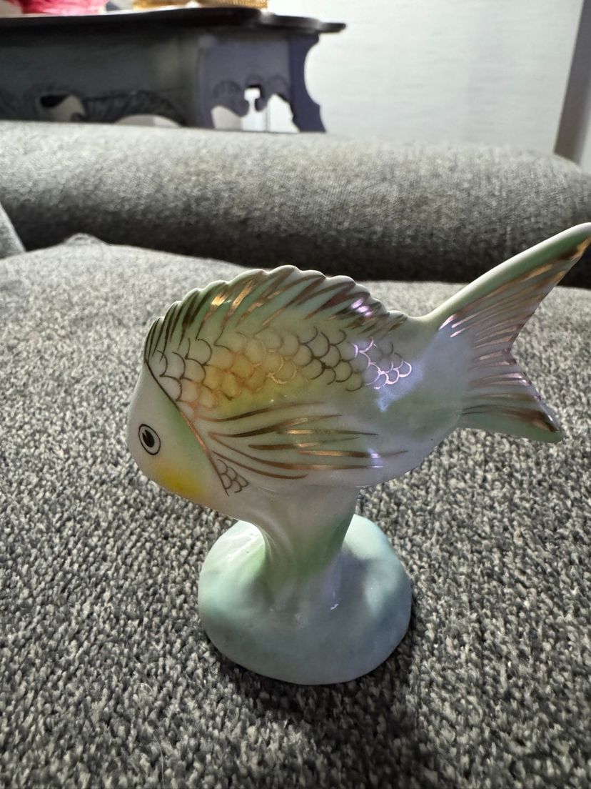 This is a vintage porcelain figurine from the Polonne Artistic Ceramics Factory (ZHK) in Ukraine. The factory was located in the Khmelnytsky region of the Soviet Union & ceased to exist in 2011. The mark on the bottom of the fish includes the letters “ZHK” and the words “MEZZ L FEST IT.” This particular piece is a veil-tail fish, with a hand-painted design featuring 24 Ct. Gold trim. Dated Mid-Century Modern 1960’s. Approximate Measurement: 2.9” H X 3” W. This fish would be used as a miniature decor piece or as a decorative item in an aquarian.