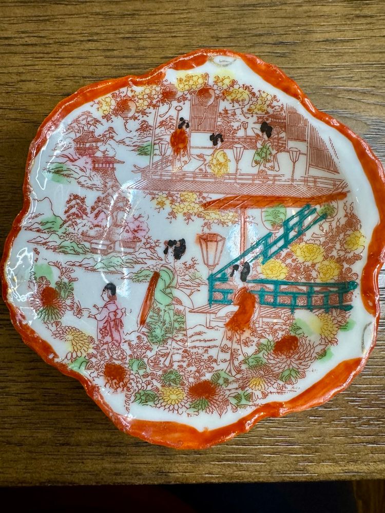 vintage Japanese porcelain bowl, often referred to as "Geisha Girl" ware. This type of porcelain is characterized by its hand-painted decoration of ladies in kimonos, often in garden or pagoda scenes.
