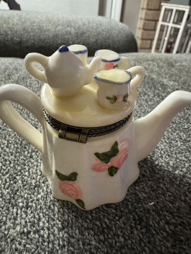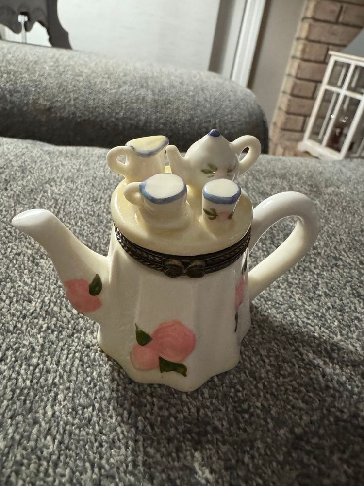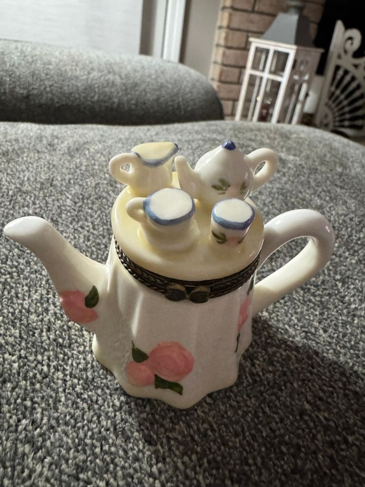 “Afternoon Tea.” This is an adorable hinged box, designed to hold small items like jewelry. This trinket box is hand-painted with pink flowers and has a miniature tea set on its lid. Made by Direct Connection, Industry Ca. 1997-2000. Approximate Measurements: 3” L X 4” W