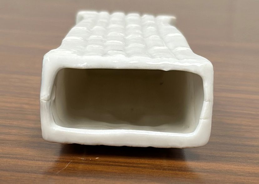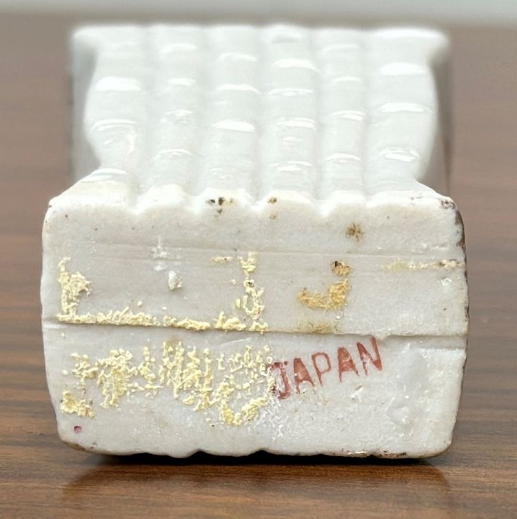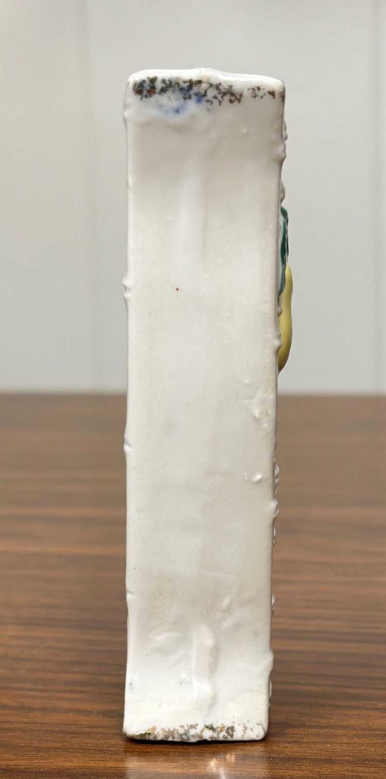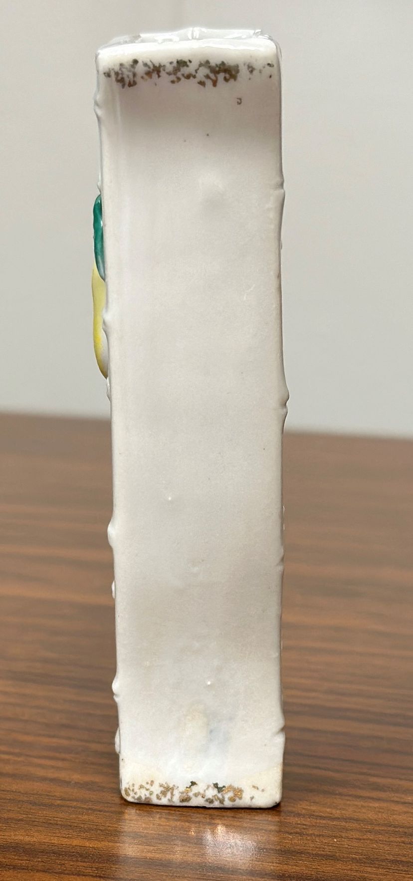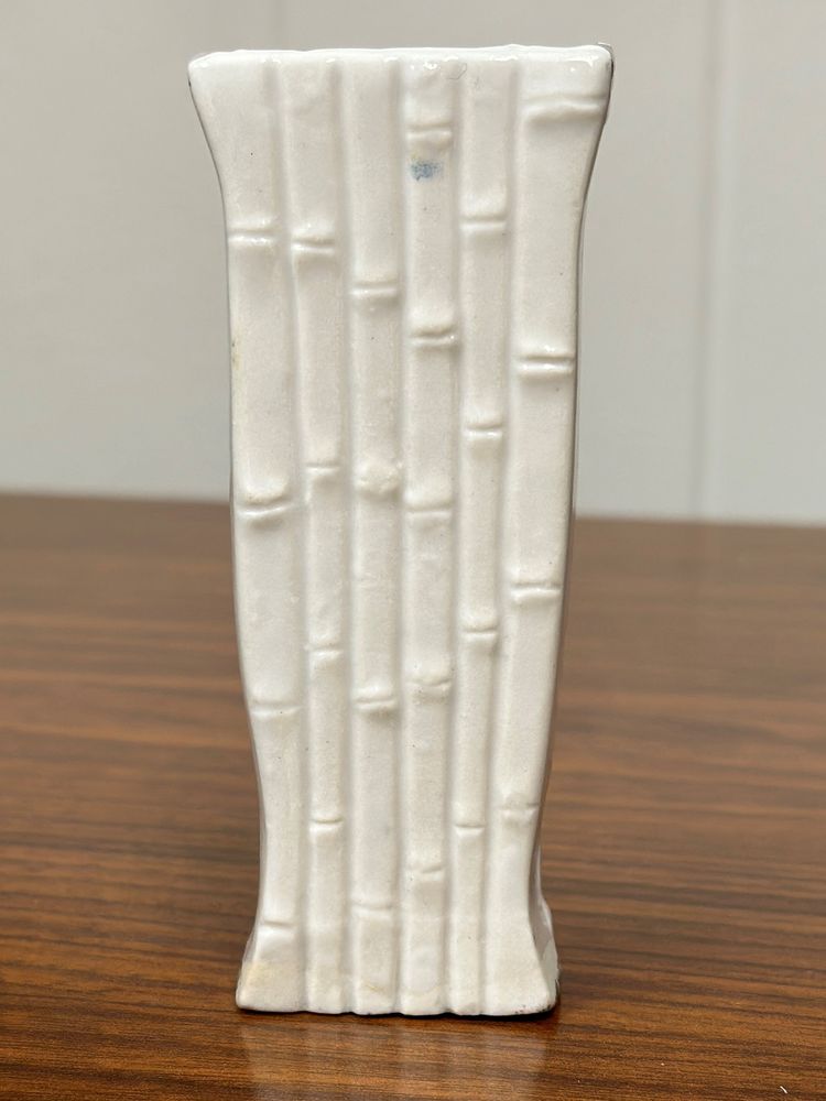 Vintage Japan white ceramic (maybe bone china), or porcelain mini bud vase with bamboo motif textured surface and hand painted fruit.
