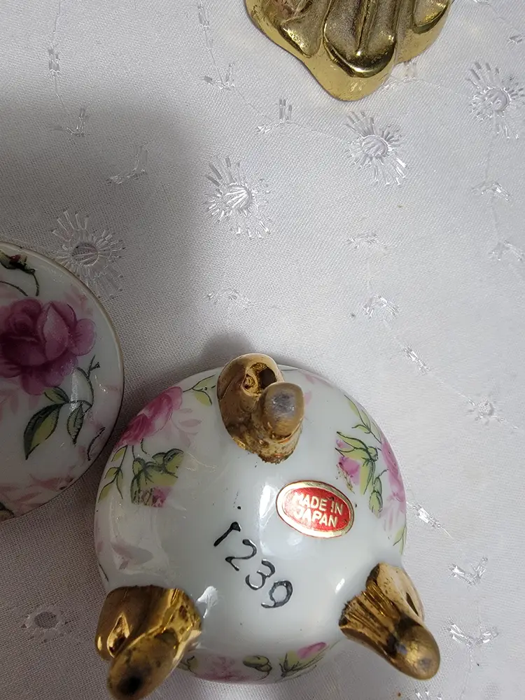 3 footed gold trim and accents with pink rose buds 2x3" Made in Japan sticker #1239