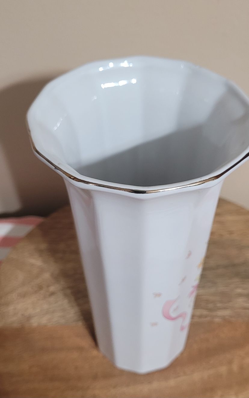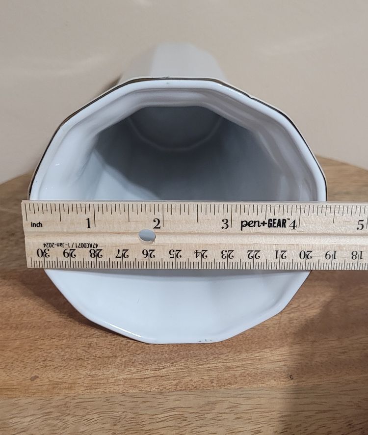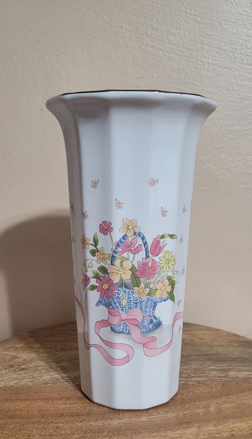 This vintage porcelain vase features a beautiful white multi-colored floral basket pattern, making it a charming decorative collectible for any room. Standing at 8 inches tall, this heptagon-shaped vase is perfect for all occasions and adds an elegant touch to any space.