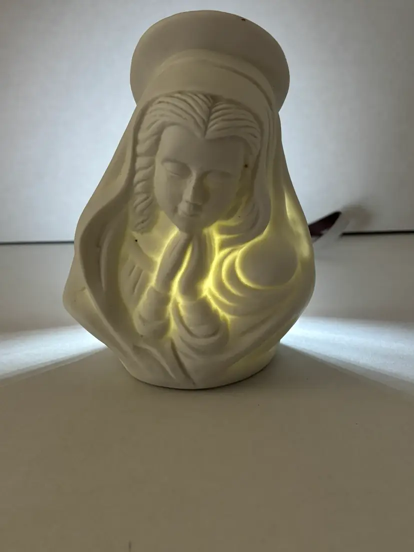 This vintage porcelain Virgin Mary/Madonna candle holder features an elegant white design, making it a beautiful addition to any religious or spiritual decor. The unbranded piece showcases intricate details and portrays the Virgin Mary figure, perfect for Christians looking to add a touch of faith to their home. Made of porcelain, this collectible item adds a timeless element to any space and can serve as a meaningful reminder of faith and devotion.