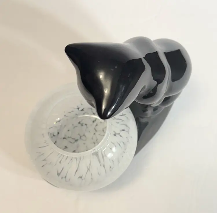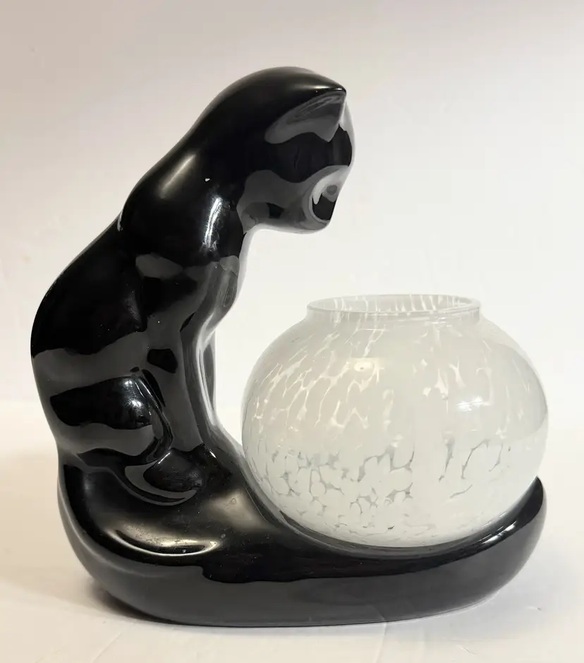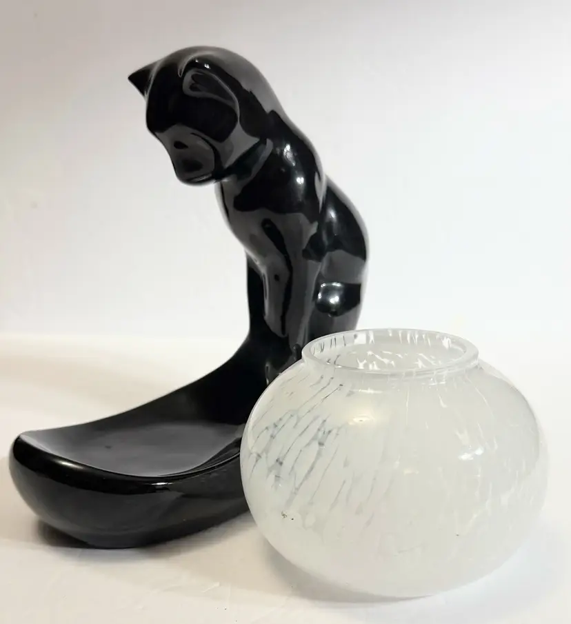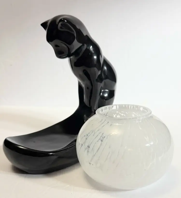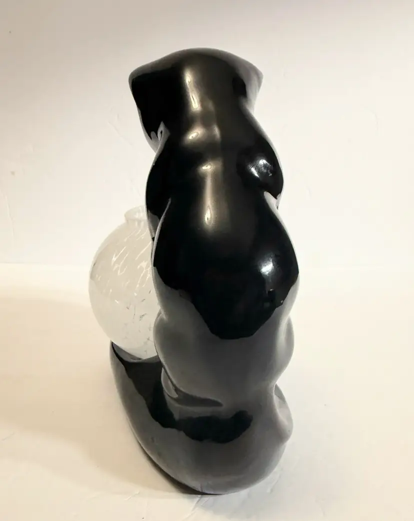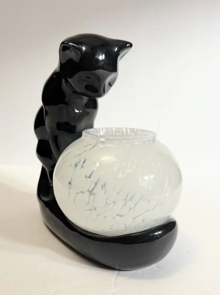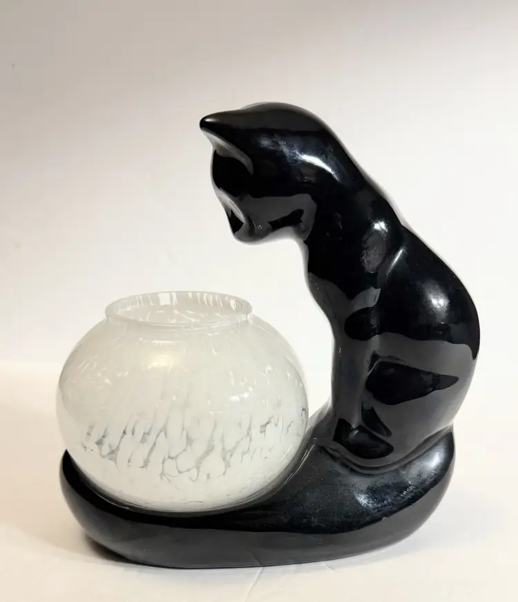 This vintage black cat sculpture with a fish bowl plant holder by Vandar Imports is a charming collectible piece made of ceramic. The 9-inch tall figurine features a unique design that adds a touch of whimsy to any space. Handcrafted in the United States, this one-of-a-kind piece is perfect for cat lovers or collectors of animal figurines. The intricate details of the cat and fish bowl make it a standout piece in any collection.