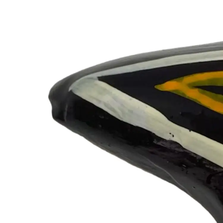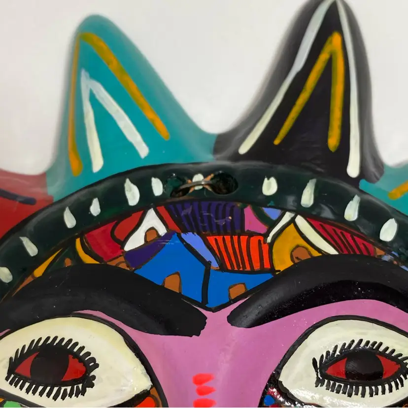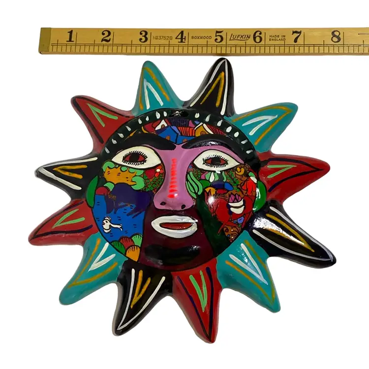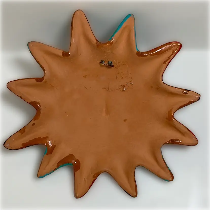 Vintage pottery sun approximately 8 inch width and height. Fun sun with vivid colours, nice details and a hanger on the back for displaying. Very good condition with little paint loss, photo’s 4 and 6. Photo 4 shows a spot that is smooth to the touch. Colourful piece!