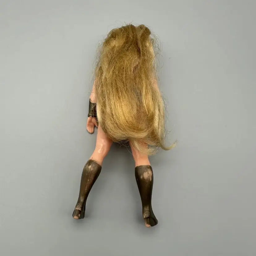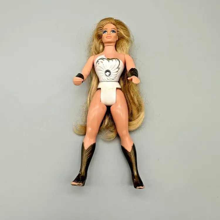 Vintage 1984 Mattel She-Ra Princess of Power Action Figure Doll Condition: Overall Good pre-owned condition with signs of paint wear Paint wear on torso, boots, and arm bracers as shown in photos Doll only, no accessories or cape included Hair is original and shows frizzing with age Boots and bracers molded in brown, signature white and gold costume bodice with jewel detail Markings on back read "© Mattel, Inc 1984" Arms and legs move freely, position holds Figure measures approximately 5.5 inches tall Iconic collectible from the Masters of the Universe toy line (MOTU) She-Ra is the sister of He-Man, a fan-favorite character from 1980s pop culture Perfect for vintage toy collectors or nostalgic display Please review all photos for condition and details