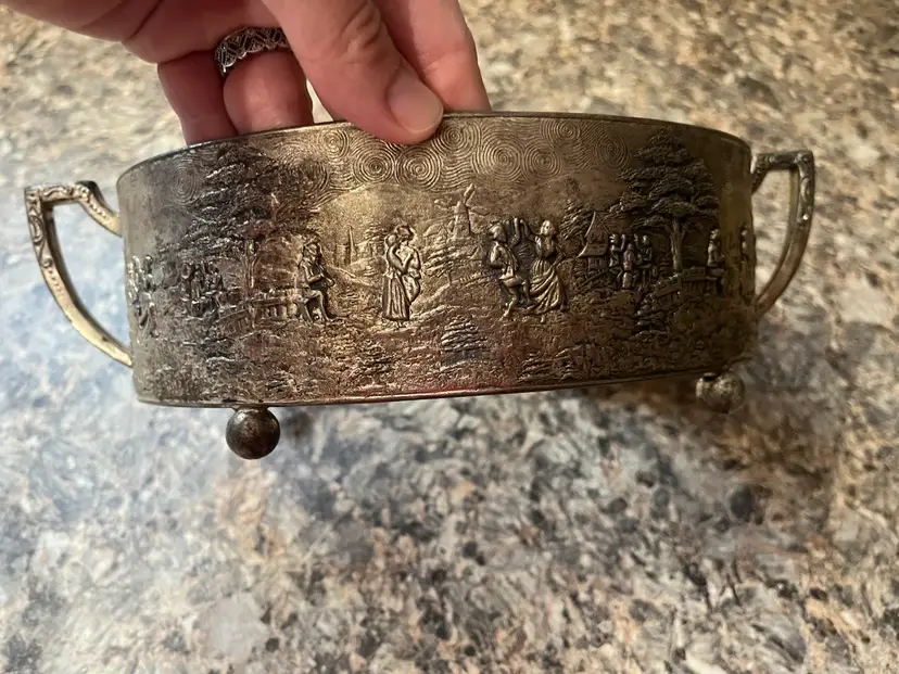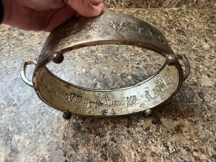This particular casserole dish is likely paired with a silver-plated holder, a common practice in the early to mid-20th century to elevate the presentation of serving dishes. These holders often featured decorative embossed designs, such as pastoral scenes or floral motifs, adding an element of elegance to dining tables. The accompanying serving spoon, with its ornate pierced bowl, complements the style of the holder, suggesting a coordinated set intended for serving. Such sets were popular for special occasions and as decorative as well as functional kitchenware.