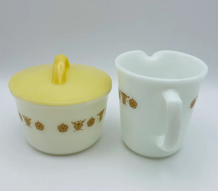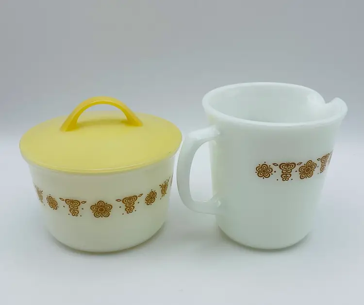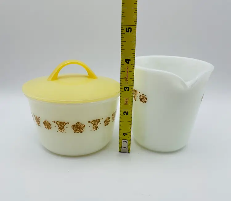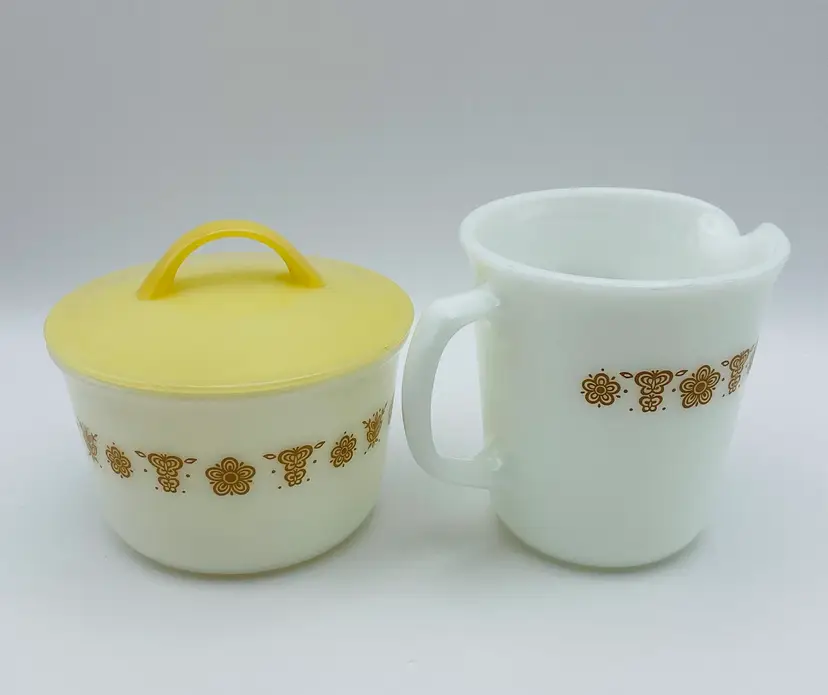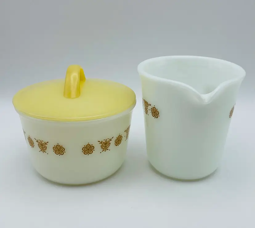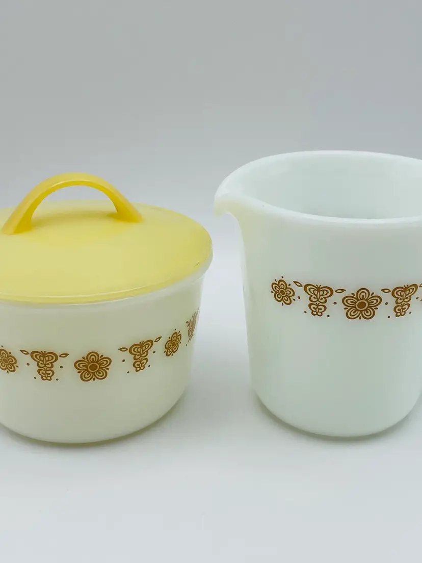 Vintage, Pyrex, Corning, NY USA, Gold “Butterfly” Pattern, Creamer & Covered Sugar Bowl. Nice Condition! Please see pictures for measurements.