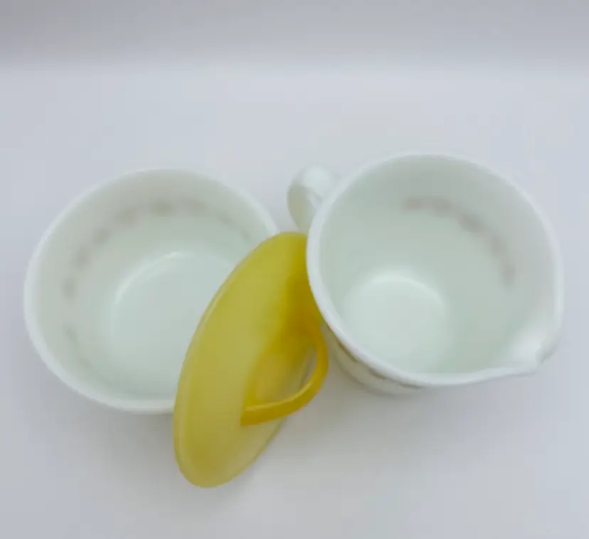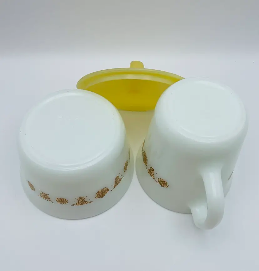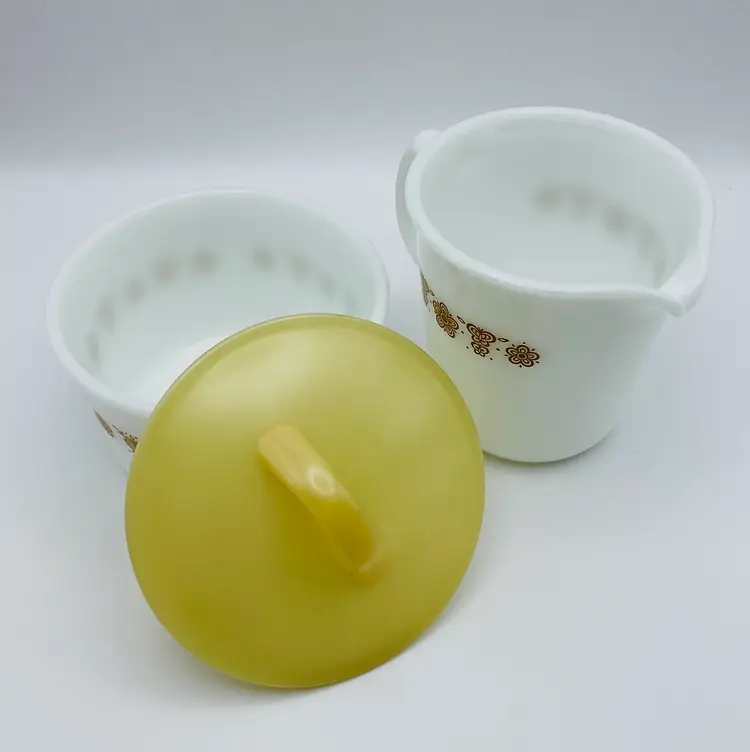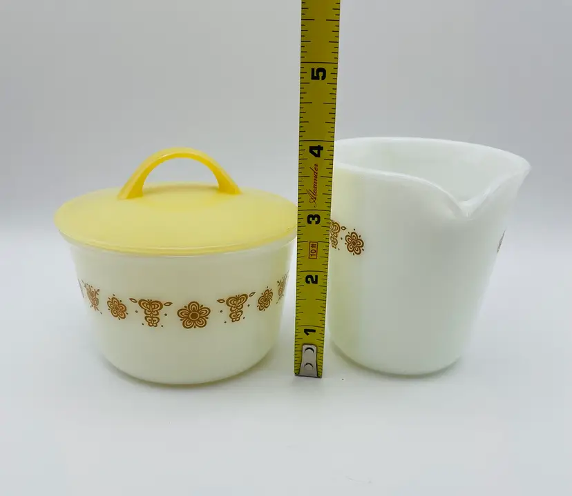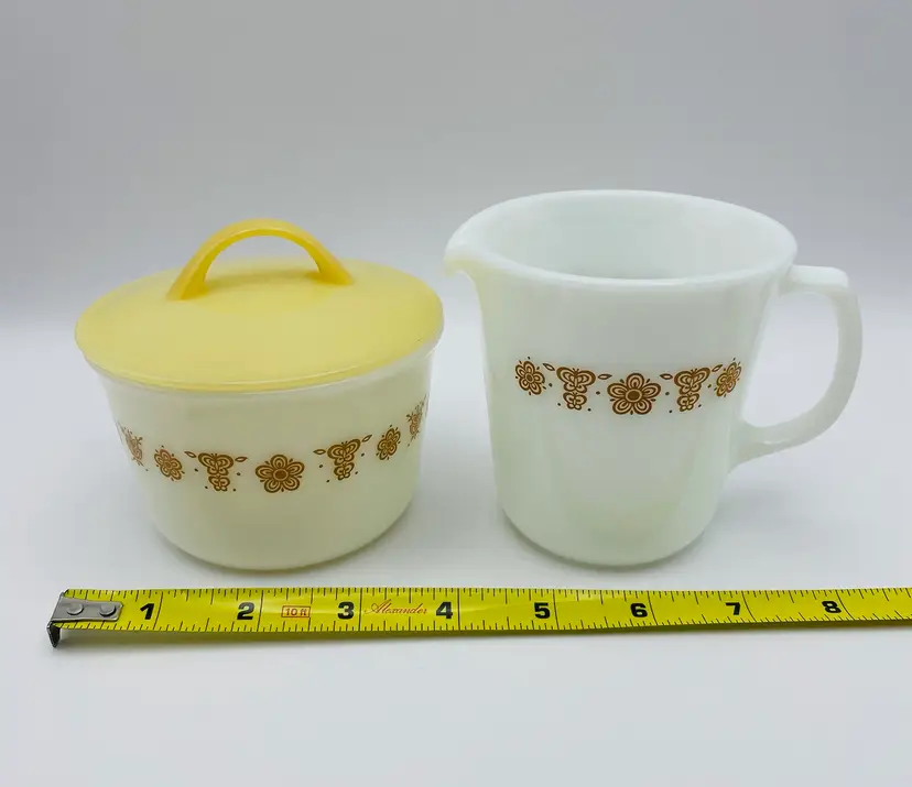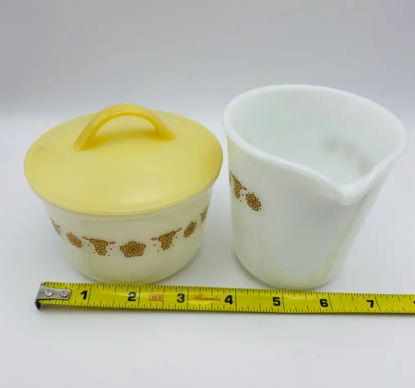 Vintage, Pyrex, Corning, NY USA, Gold “Butterfly” Pattern, Creamer & Covered Sugar Bowl. Nice Condition! Please see pictures for measurements.