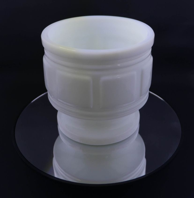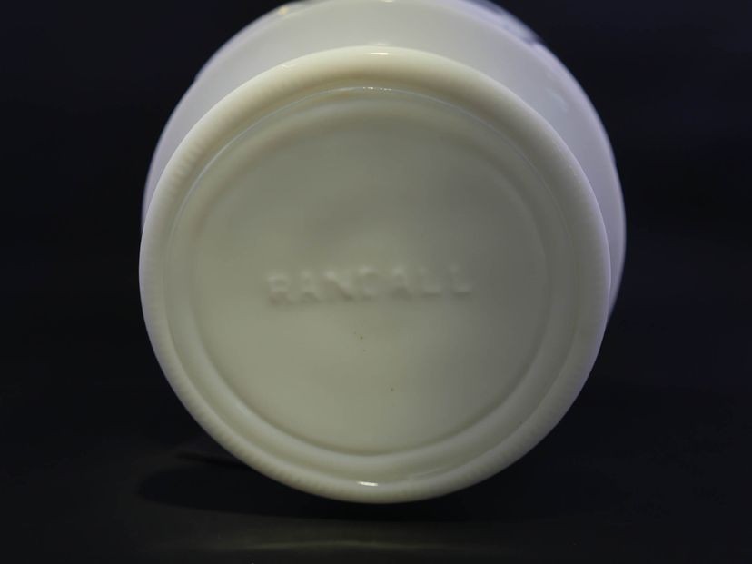A round, opaque white milk glass dish or planter with a pedestal base and a subtle raised square design on the body. The piece stands approximately 4.5 inches tall. The base is marked Randall in raised letters.