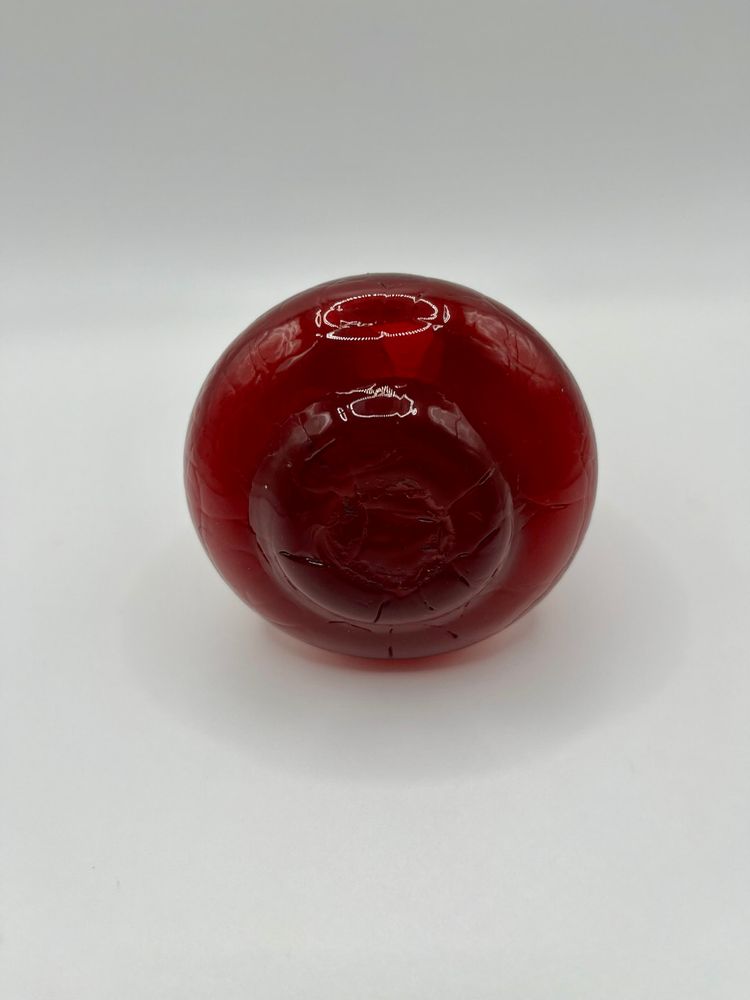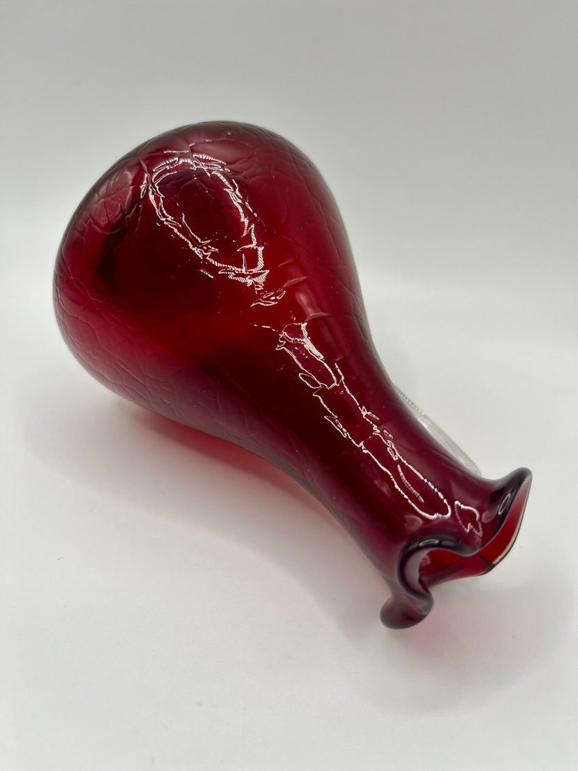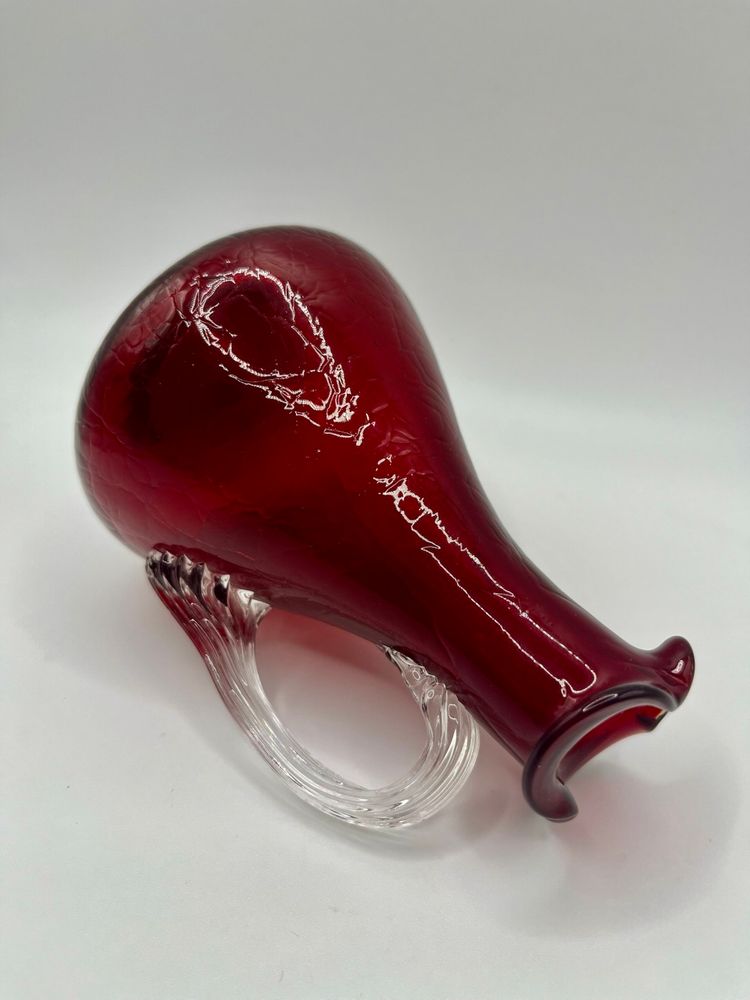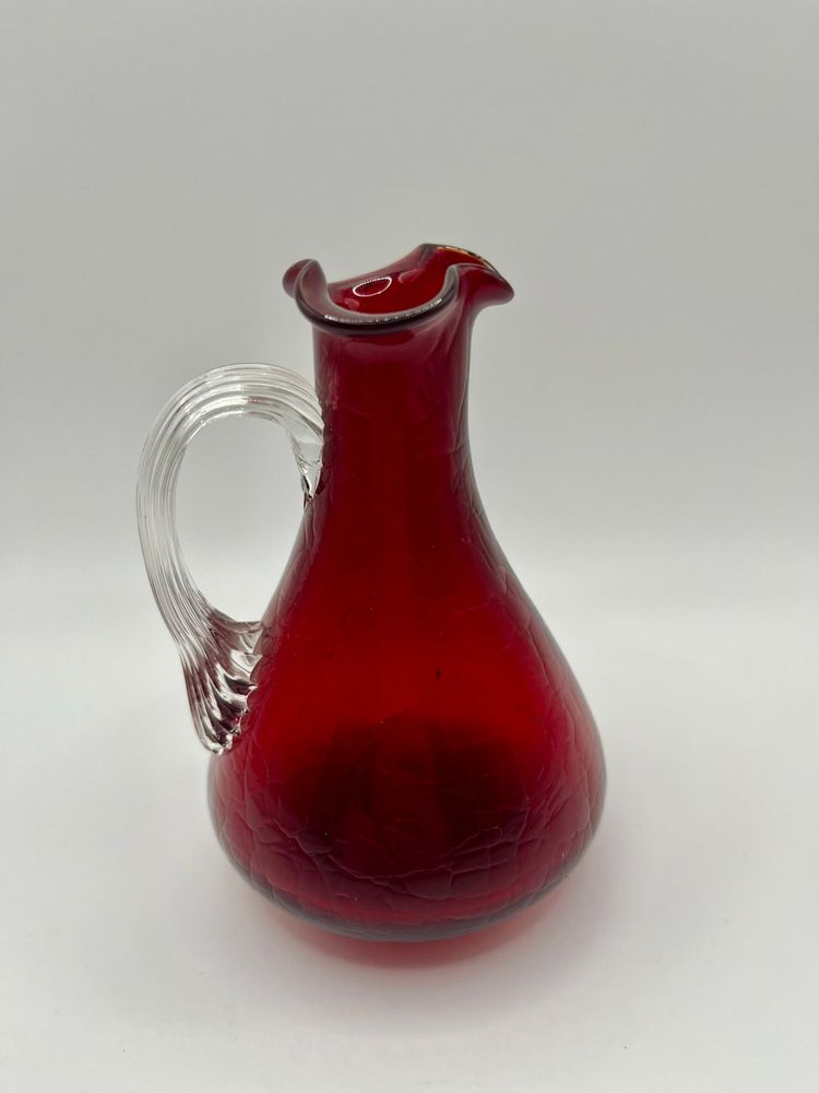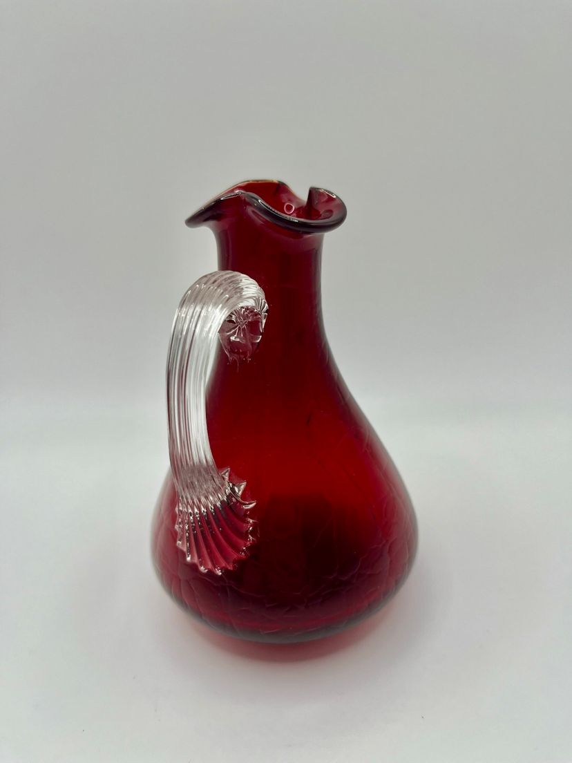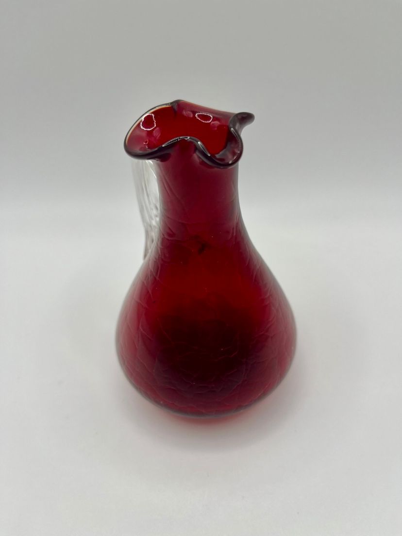 Vintage ruby red crackle glass pitcher from the mid-20th century. Hand-blown crackle glass in a vibrant ruby red. Features a clear, ribbed handle and a pinched or scalloped mouth. Approximately 4 3/4” in excellent condition. No chips or cracks.