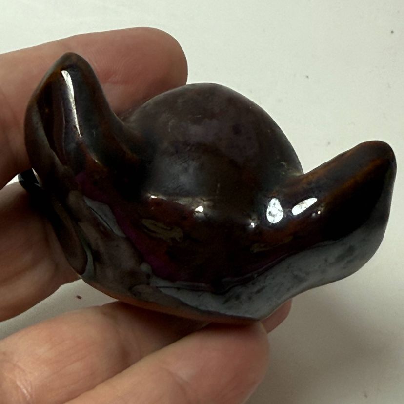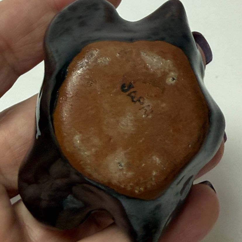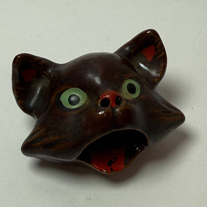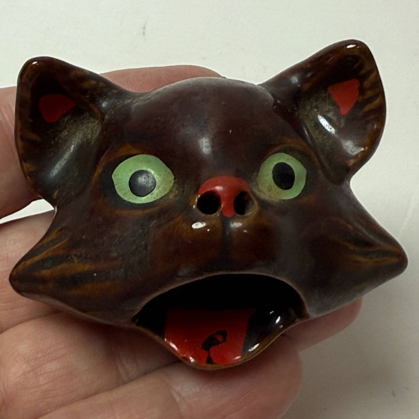 Vintage Redware Pottery Kitty Cat Head Open Mouth Handheld Ashtray Made in Japan Retro. 1.5" tall x 2.5" across. No chips, no cracks. A little bit of paint loss on tongue. Kitsch. MCM. Mid century. Opening in nostrils.